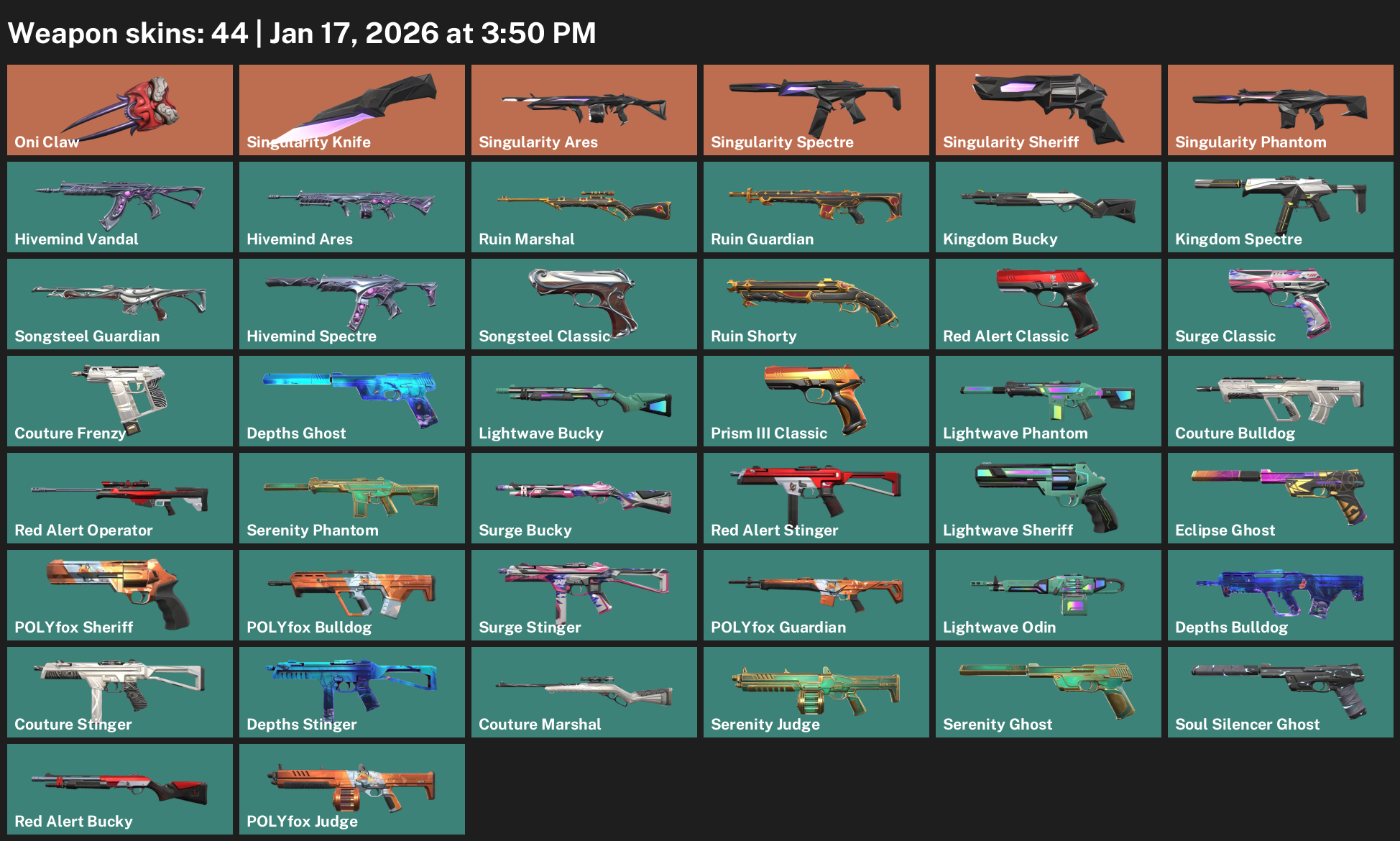 Oni Claw, Singularity Knife, Hivemind Vandal, Ruin Marshal, Kingdom Bucky, Songsteel Guardian, Red Alert Classic, Couture Frenzy, Depths Ghost, Lightwave Phantom