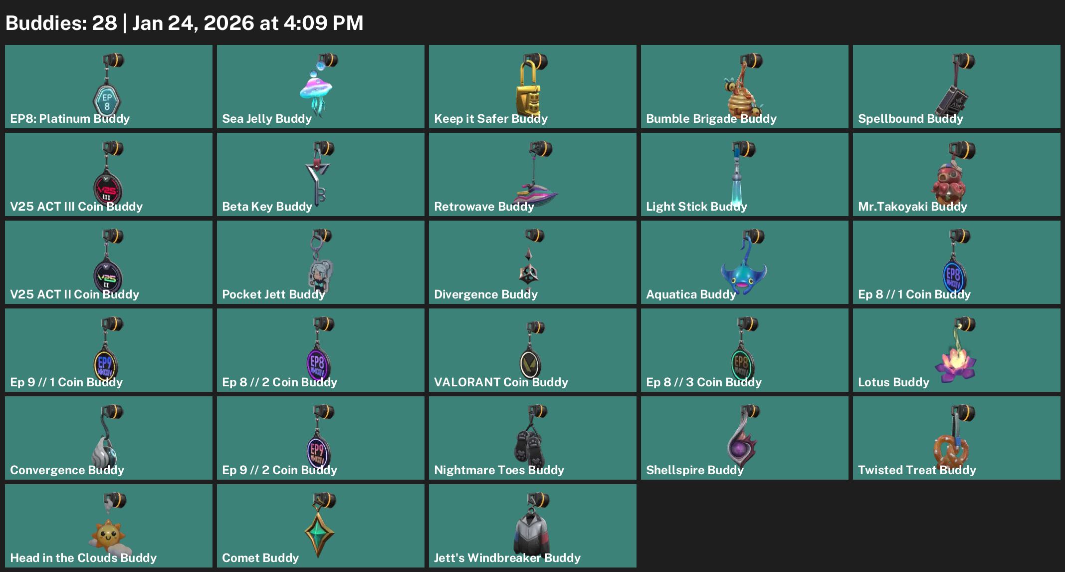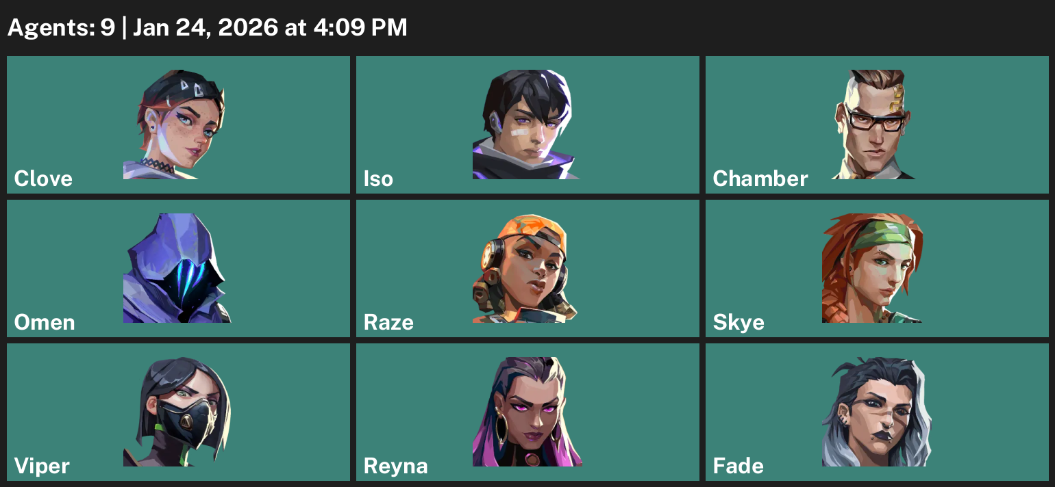 Clove, Iso, Chamber, Omen, Raze, Skye, Viper, Reyna, Fade