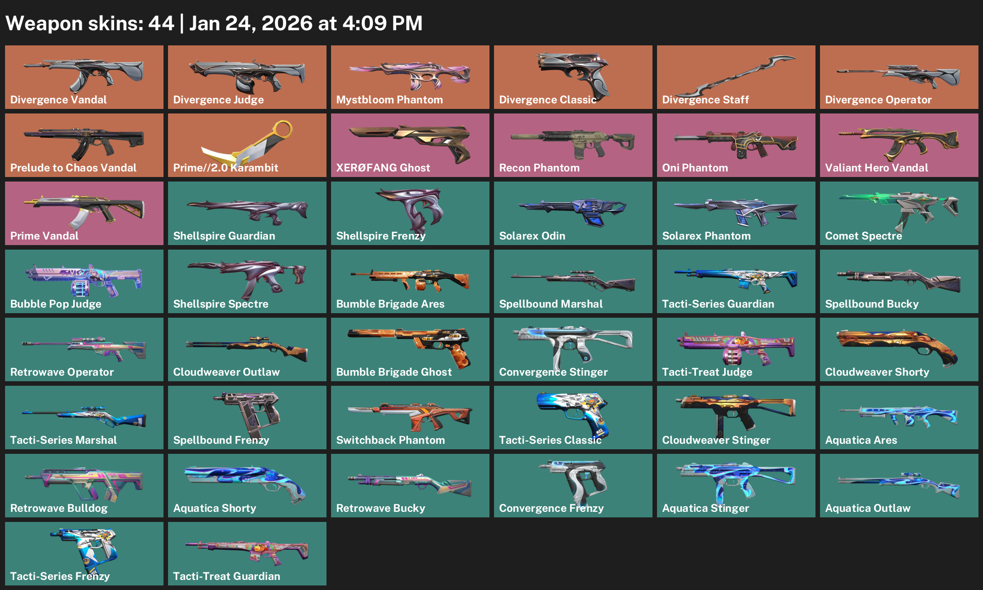 Divergence Vandal, Mystbloom Phantom, Prime//2.0 Karambit, XERØFANG Ghost, Shellspire Guardian, Solarex Odin, Comet Spectre, Bubble Pop Judge, Bumble Brigade Ares, Spellbound Marshal, Retrowave Operator