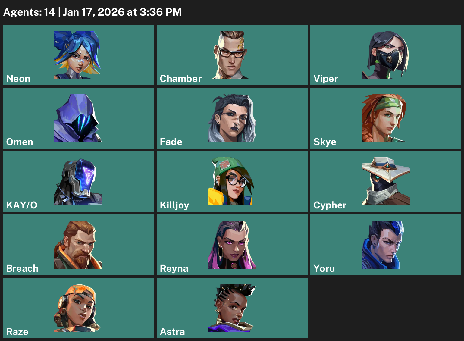 Neon, Chamber, Viper, Omen, Fade, Skye, KAY/O, Killjoy, Cypher, Breach, Reyna, Yoru, Raze, Astra