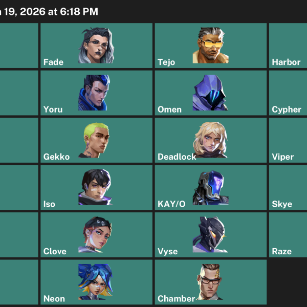 Killjoy, Chamber, Raze, Vyse, Astra, Skye, Breach, Fade, KAY/O, Yoru, Reyna, Gekko, Tejo, Clove, Waylay, Cypher, Omen, Iso, Deadlock, Harbor, Viper, Neon