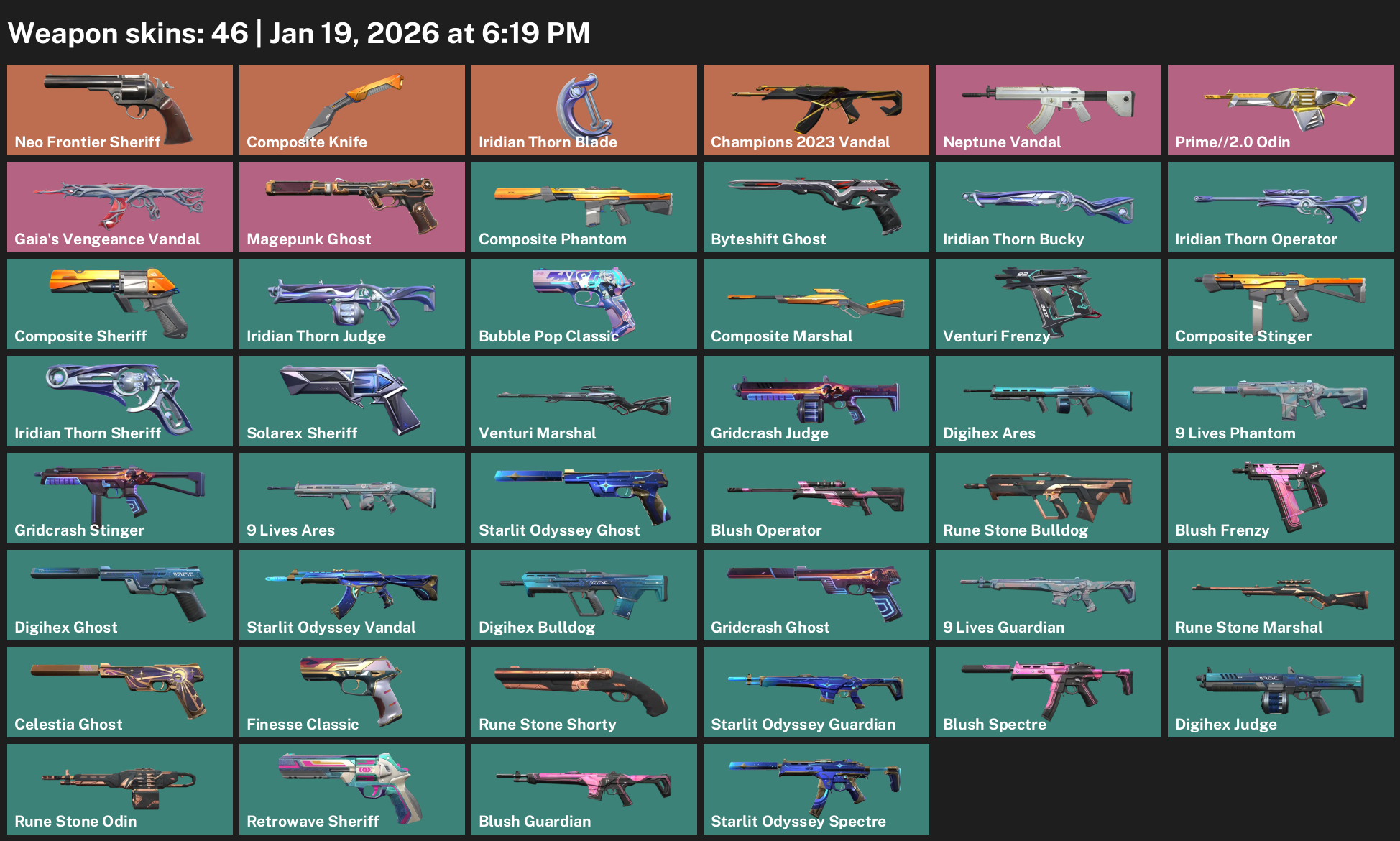 Neo Frontier Sheriff, Composite Knife, Iridian Thorn Blade, Champions 2023 Vandal, Prime//2.0 Odin, Magepunk Ghost, Bubble Pop Classic, Venturi Frenzy, Gridcrash Judge, Digihex Ares, 9 Lives Phantom