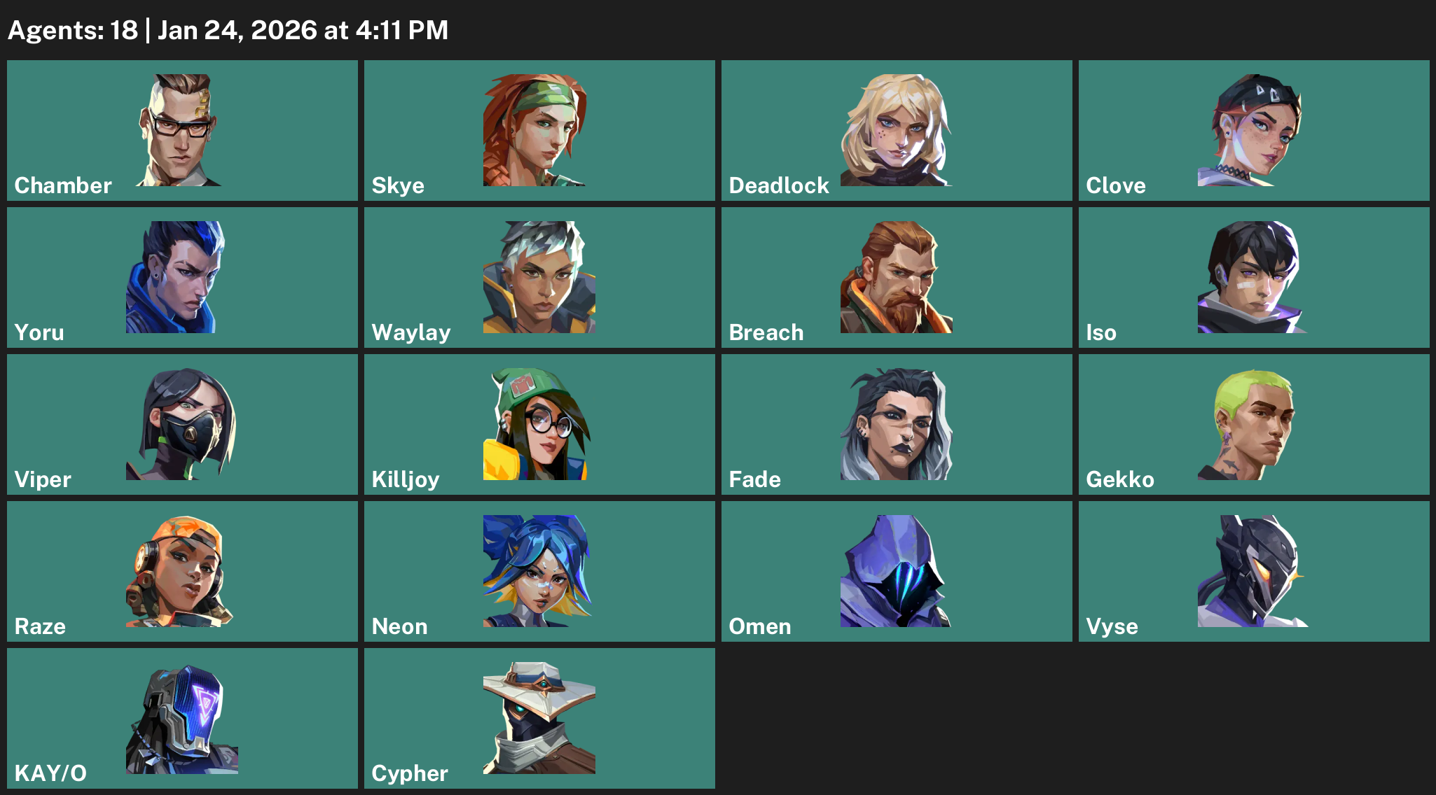 Chamber, Skye, Deadlock, Clove, Yoru, Waylay, Breach, Iso, Viper, Killjoy, Fade, Gekko, Raze, Neon, Omen, Vyse, KAY/O, Cypher