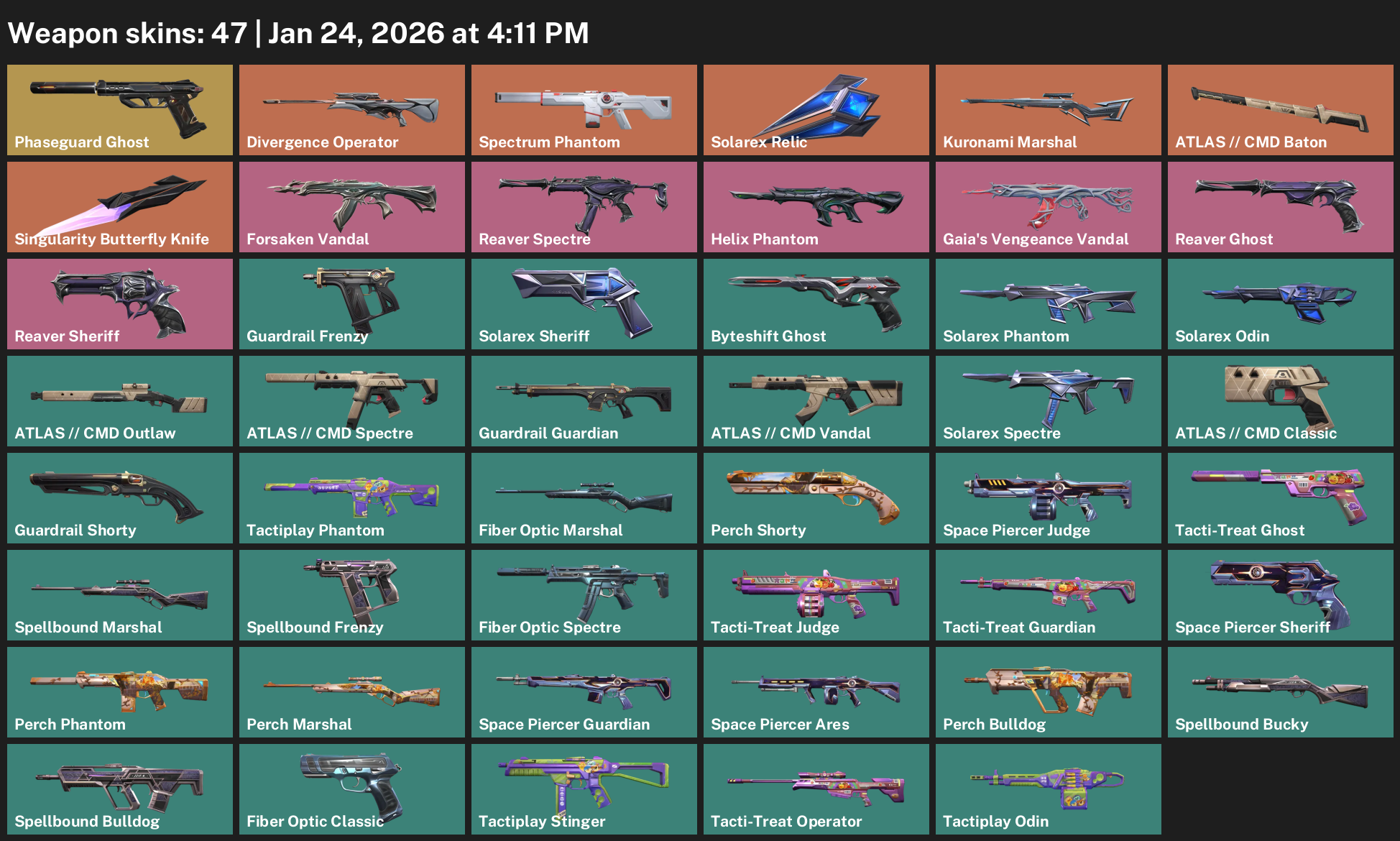 Phaseguard Ghost, Divergence Operator, Spectrum Phantom, Solarex Relic, Kuronami Marshal, ATLAS // CMD Baton, Singularity Butterfly Knife, Forsaken Vandal, Reaver Spectre, Guardrail Frenzy