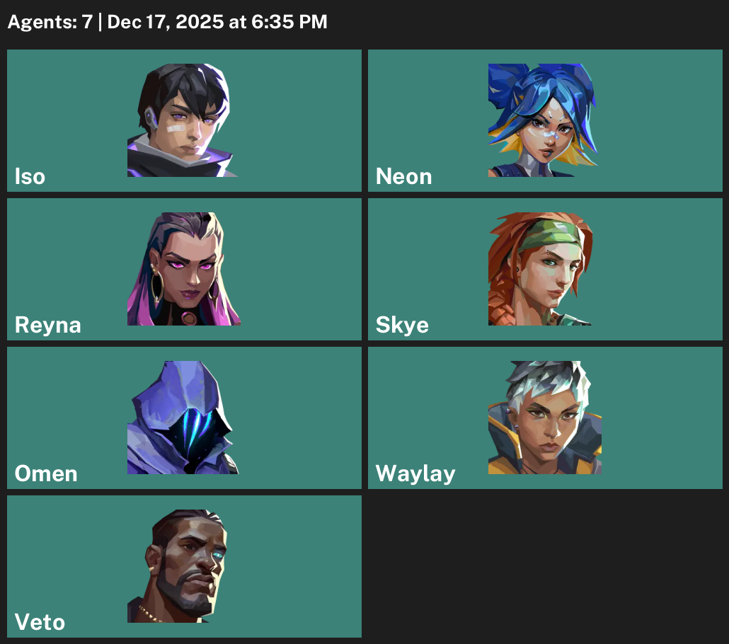 Iso, Neon, Reyna, Skye, Omen, Waylay