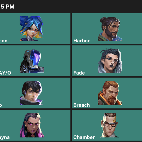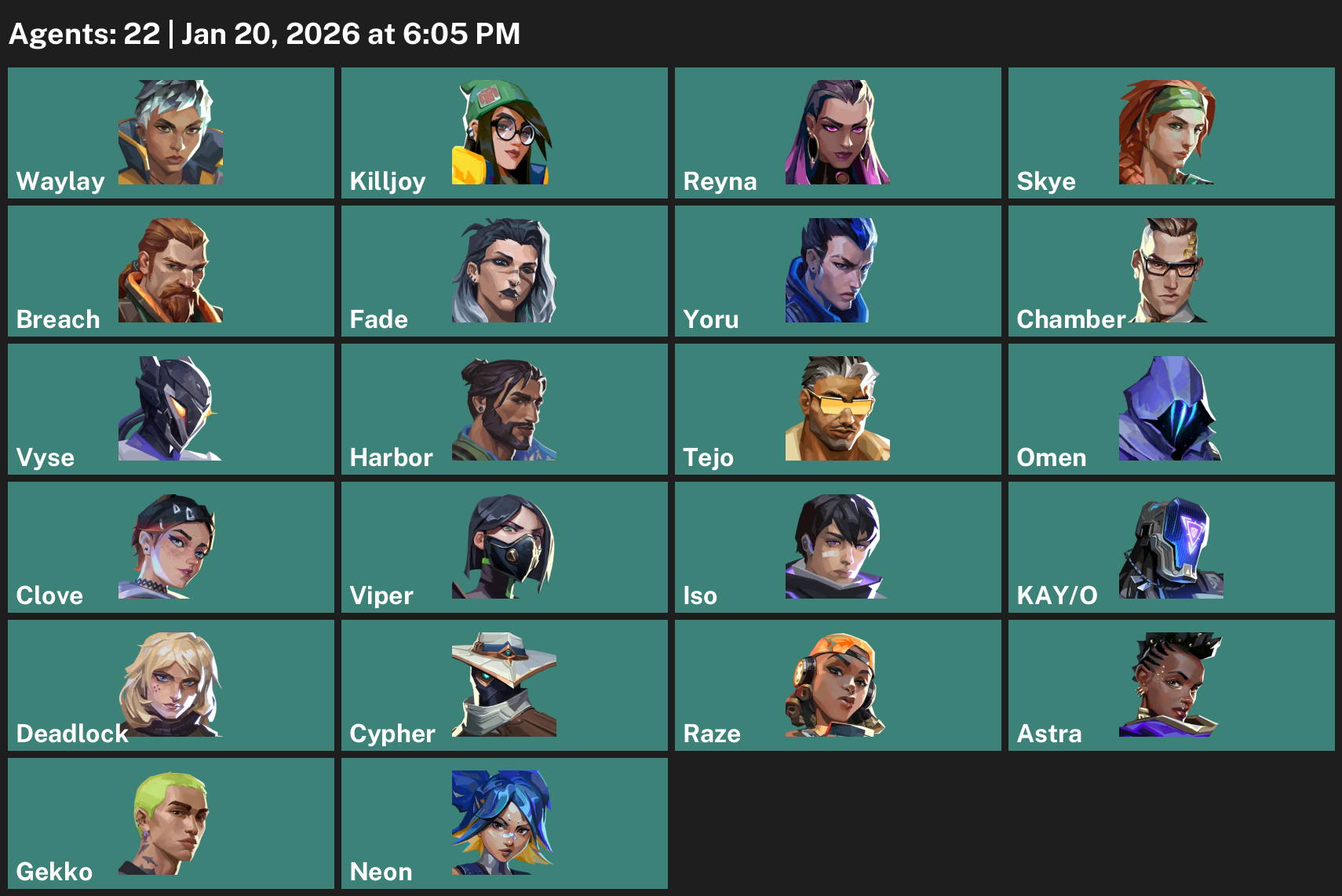 Waylay, Killjoy, Reyna, Skye, Breach, Fade, Yoru, Chamber, Vyse, Harbor, Tejo, Omen, Clove, Viper, Iso, KAY/O, Deadlock, Cypher, Raze, Astra, Gekko, Neon
