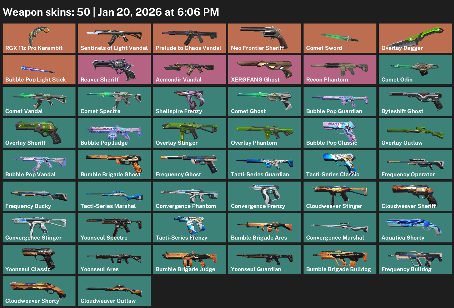 RGX 11z Pro Karambit, Sentinels of Light Vandal, Neo Frontier Sheriff, Comet Sword, Overlay Dagger, XERØFANG Ghost, Recon Phantom, Shellspire Frenzy, Bubble Pop Guardian