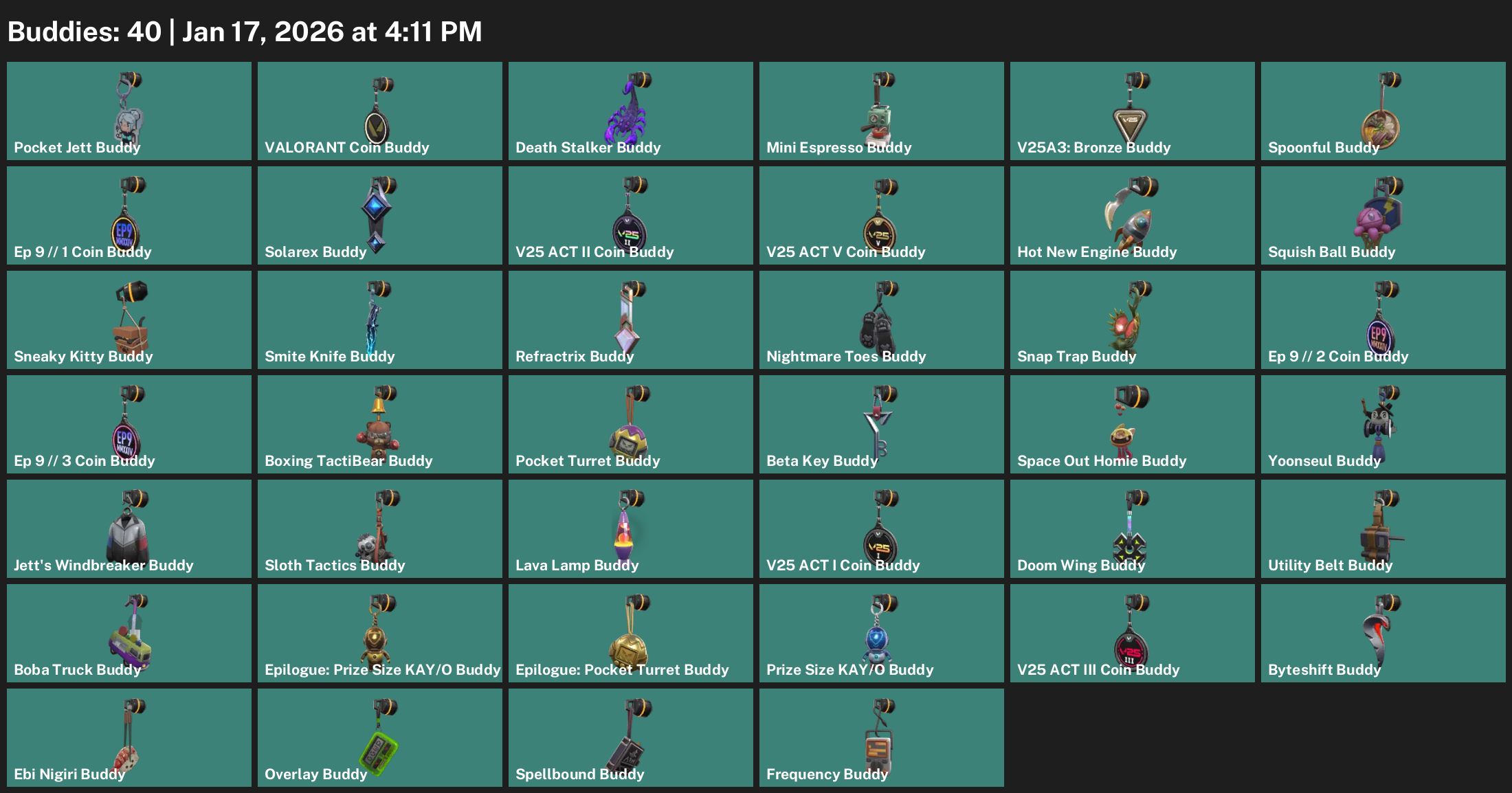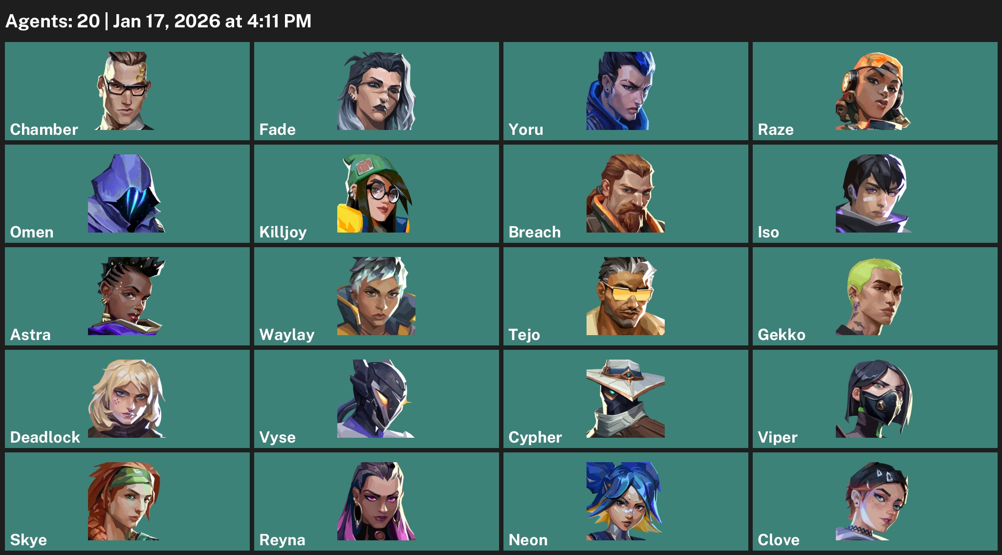 Chamber, Fade, Yoru, Raze, Omen, Killjoy, Breach, Iso, Astra, Waylay, Tejo, Gekko, Deadlock, Vyse, Cypher, Viper, Skye, Reyna, Neon, Clove