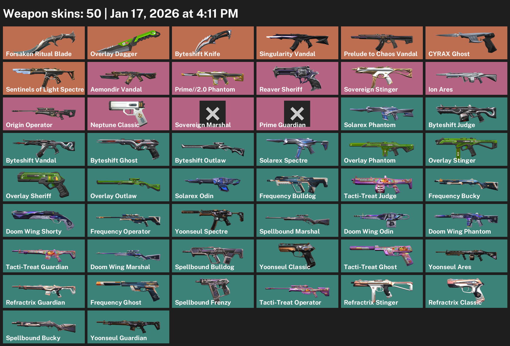 Forsaken Ritual Blade, Overlay Dagger, Byteshift Knife, Singularity Vandal, CYRAX Ghost, Sentinels of Light Spectre, Prime//2.0 Phantom, Reaver Sheriff, Sovereign Stinger, Ion Ares, Origin Operator, Neptune Classic, Prime Guardian