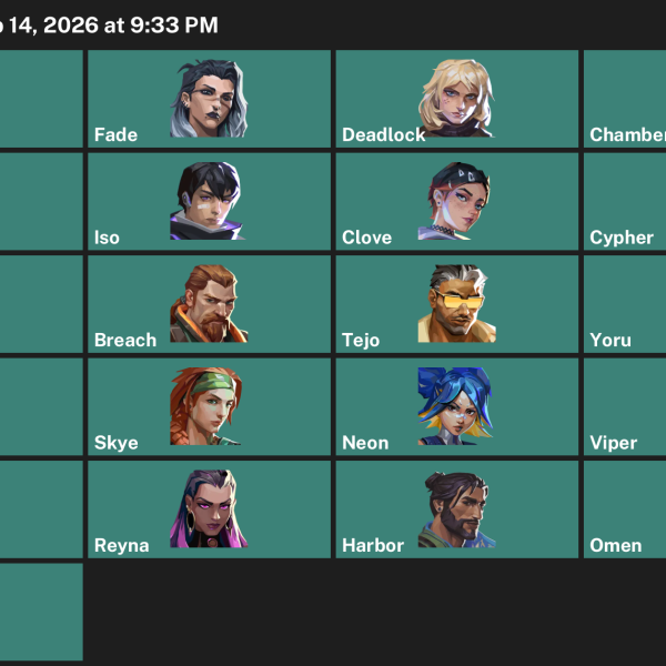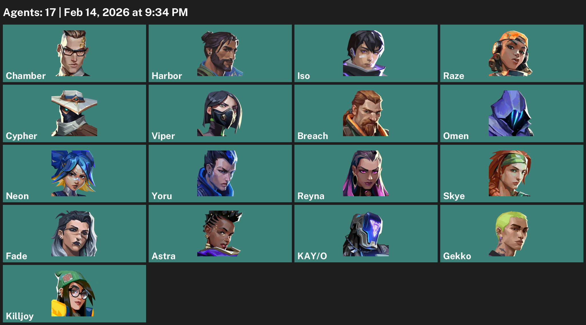 Chamber, Harbor, Iso, Raze, Cypher, Viper, Breach, Omen, Neon, Yoru, Reyna, Skye, Fade, Astra, KAY/O, Gekko, Killjoy