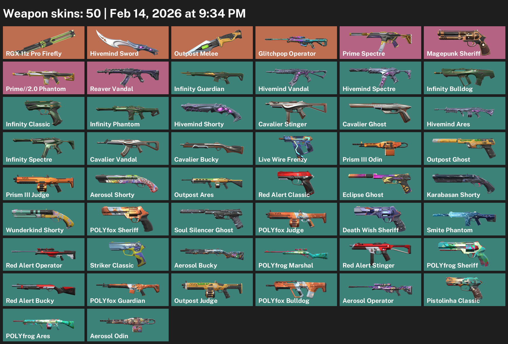 RGX 11z Pro Firefly, Hivemind Sword, Outpost Melee, Glitchpop Operator, Prime Spectre, Magepunk Sheriff, Prime//2.0 Phantom, Reaver Vandal, Infinity Guardian, Cavalier Stinger, Live Wire Frenzy, Prism III Odin