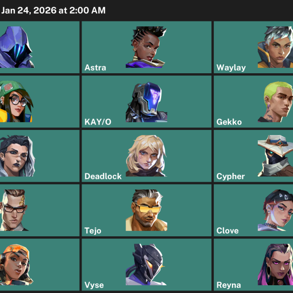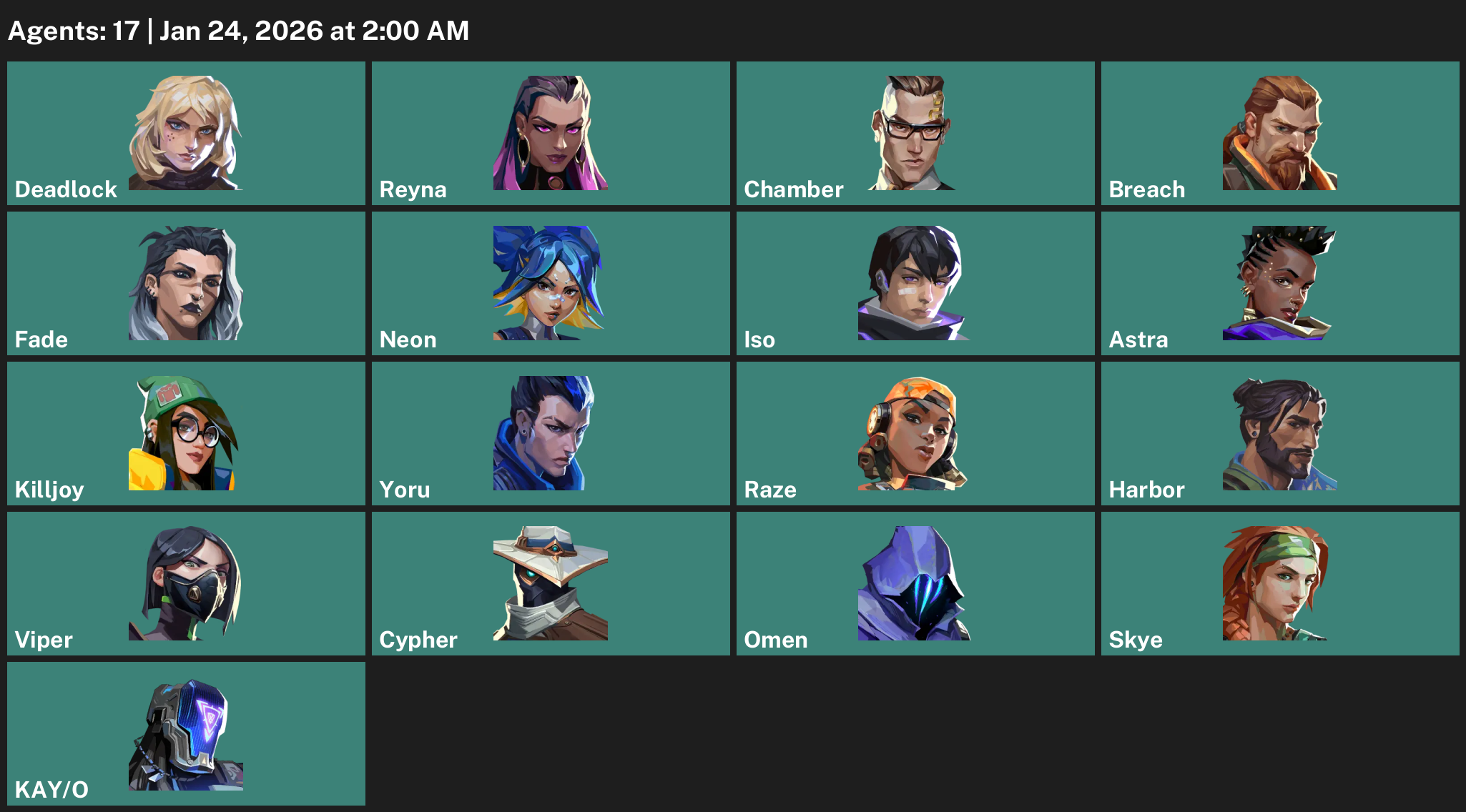 Deadlock, Reyna, Chamber, Breach, Fade, Neon, Iso, Astra, Killjoy, Yoru, Raze, Harbor, Viper, Cypher, Omen, Skye, KAY/O