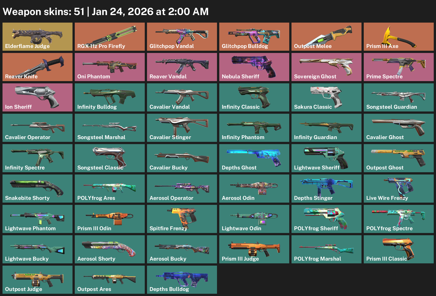 Elderflame Judge, RGX 11z Pro Firefly, Glitchpop Vandal, Outpost Melee, Prism III Axe, Reaver Knife, Oni Phantom, Nebula Sheriff, Sovereign Ghost, Prime Spectre, Infinity Bulldog, Sakura Classic, Songsteel Guardian, Cavalier Operator