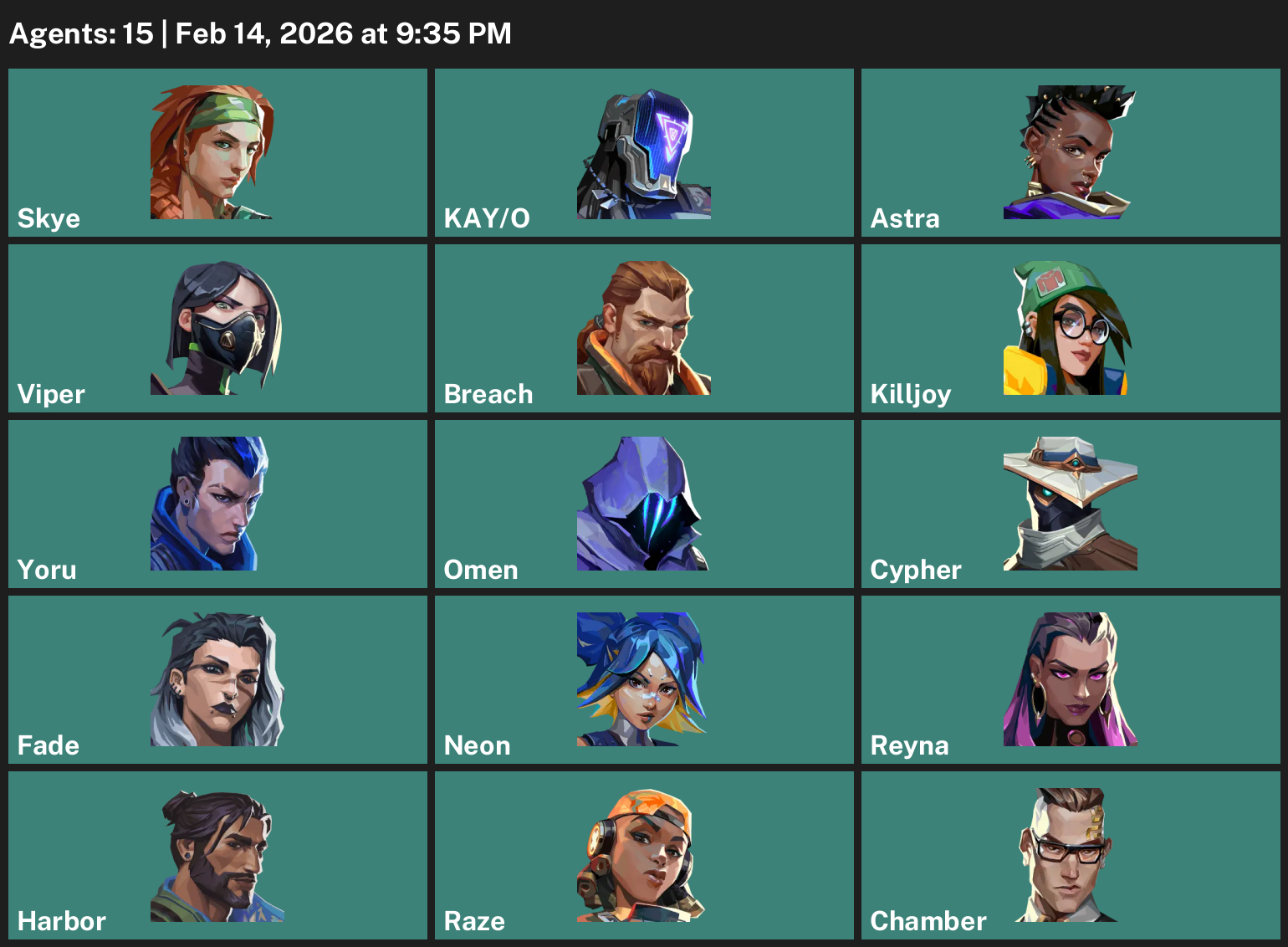 Skye, KAY/O, Astra, Viper, Breach, Killjoy, Yoru, Omen, Cypher, Fade, Neon, Reyna, Harbor, Raze, Chamber
