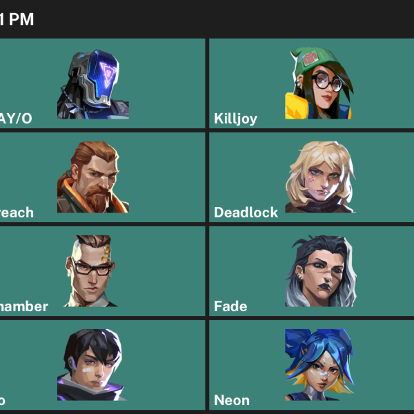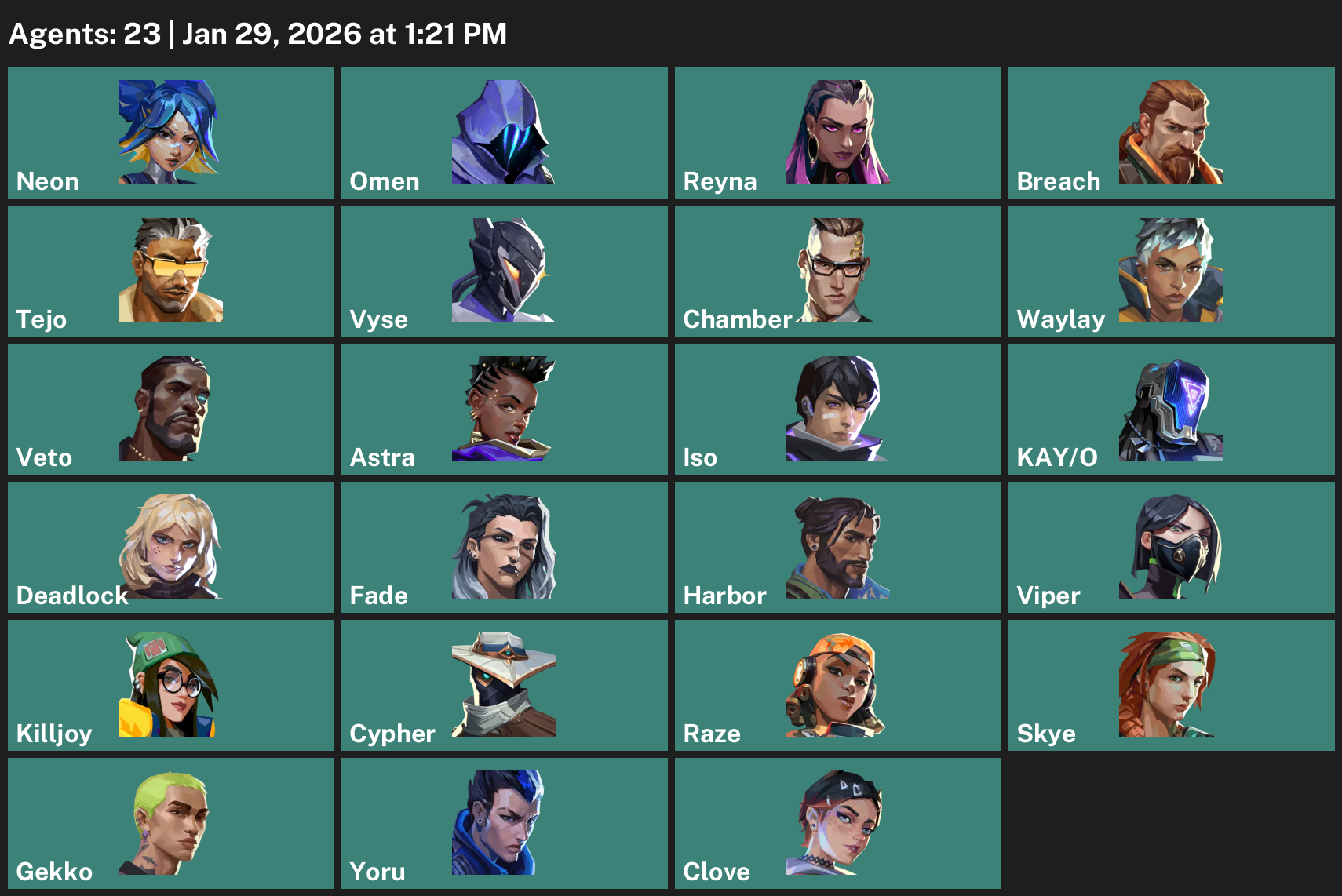 Neon, Omen, Reyna, Breach, Tejo, Vyse, Chamber, Waylay, Astra, Iso, KAY/O, Deadlock, Fade, Harbor, Viper, Killjoy, Cypher, Raze, Skye, Gekko, Yoru, Clove