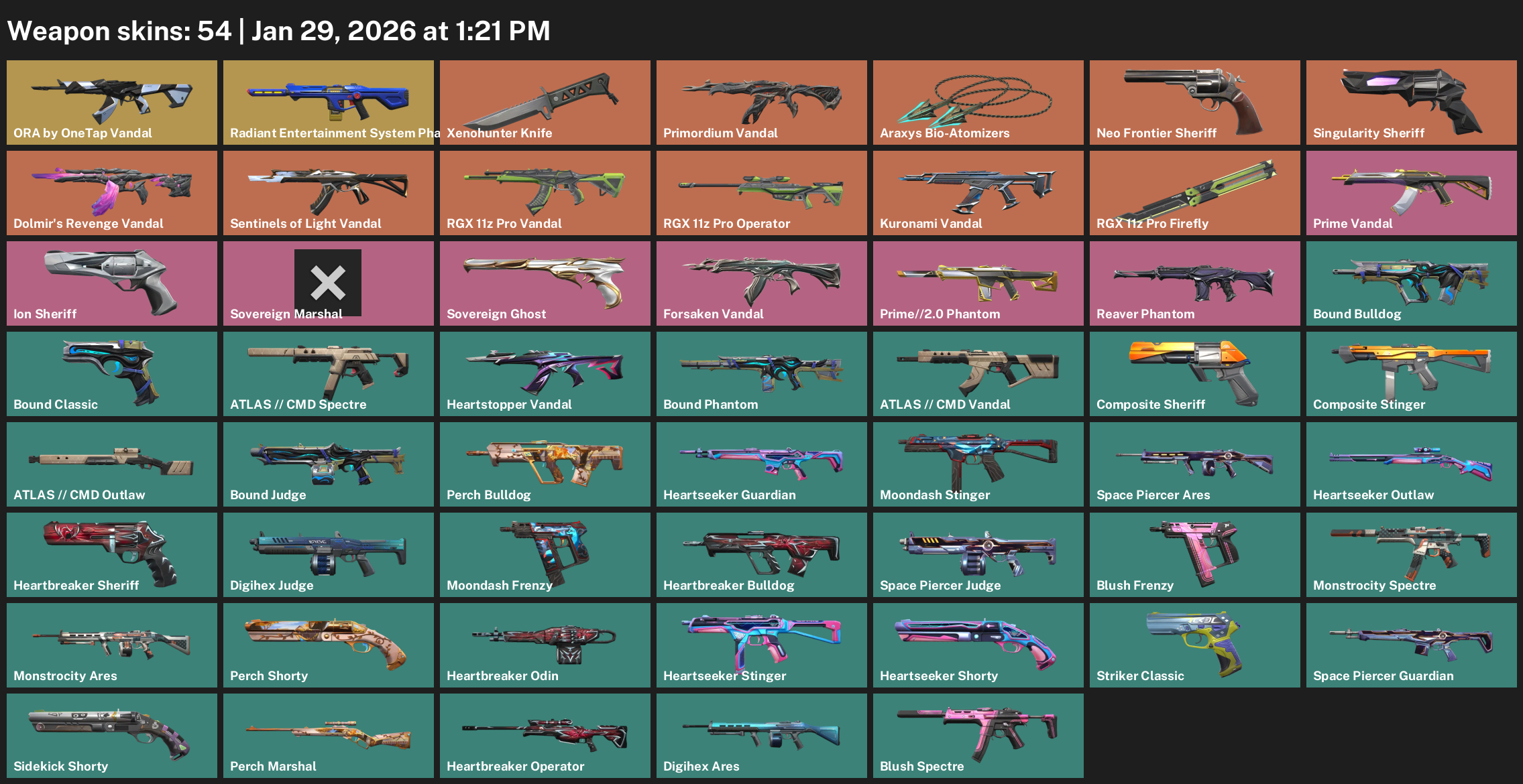Radiant Entertainment System Phantom, Xenohunter Knife, Primordium Vandal, Araxys Bio-Atomizers, Neo Frontier Sheriff, RGX 11z Pro Operator, Sovereign Marshal, Bound Bulldog, ATLAS // CMD Spectre, Composite Stinger