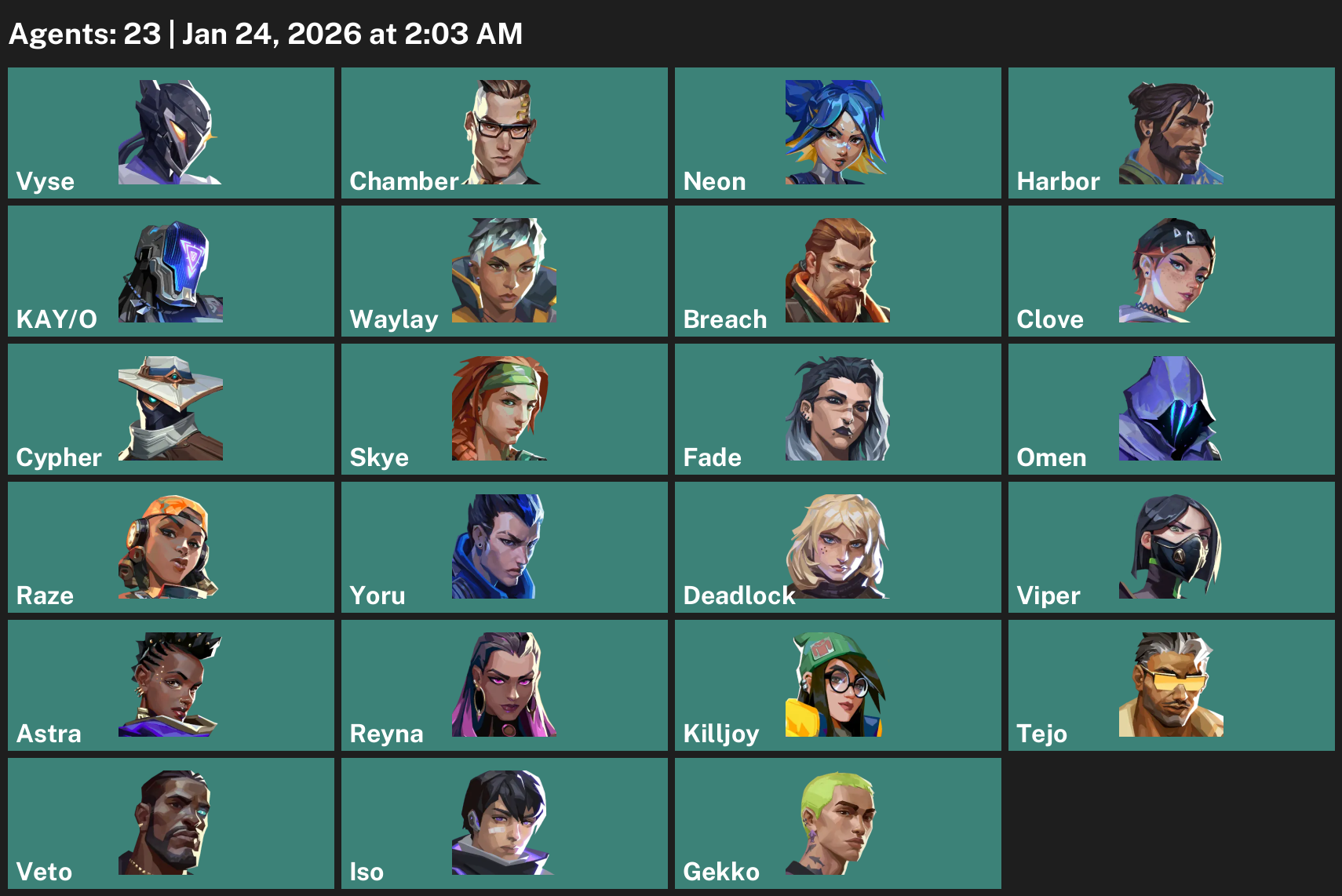 Vyse, Chamber, Neon, Harbor, KAY/O, Waylay, Breach, Clove, Cypher, Skye, Fade, Omen, Raze, Yoru, Deadlock, Viper, Astra, Reyna, Killjoy, Tejo, Iso, Gekko