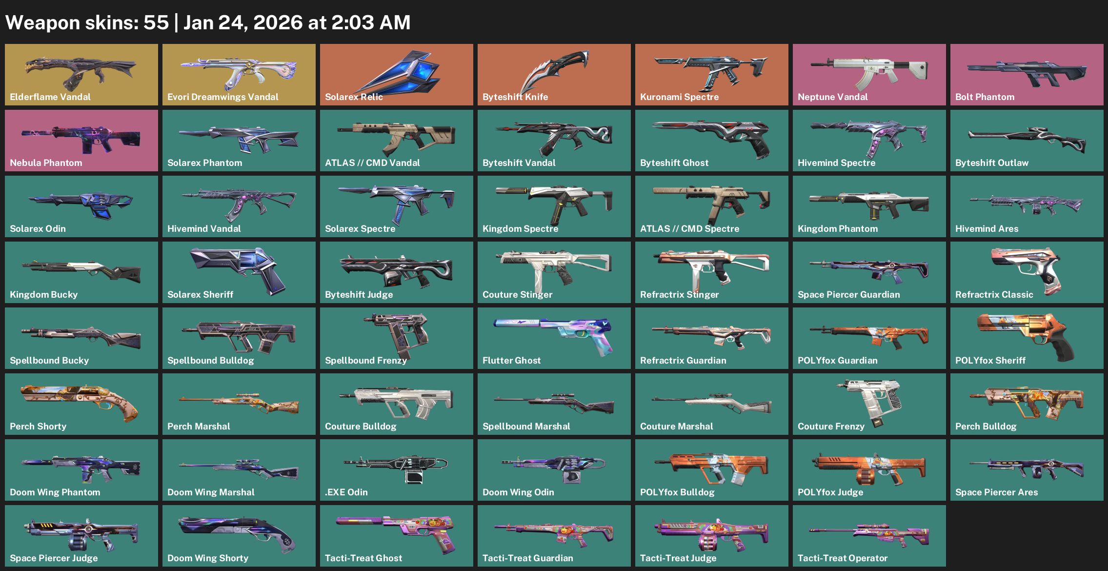 Elderflame Vandal, Solarex Relic, Byteshift Knife, Kuronami Spectre, Bolt Phantom, Hivemind Ares, Kingdom Bucky, Couture Stinger