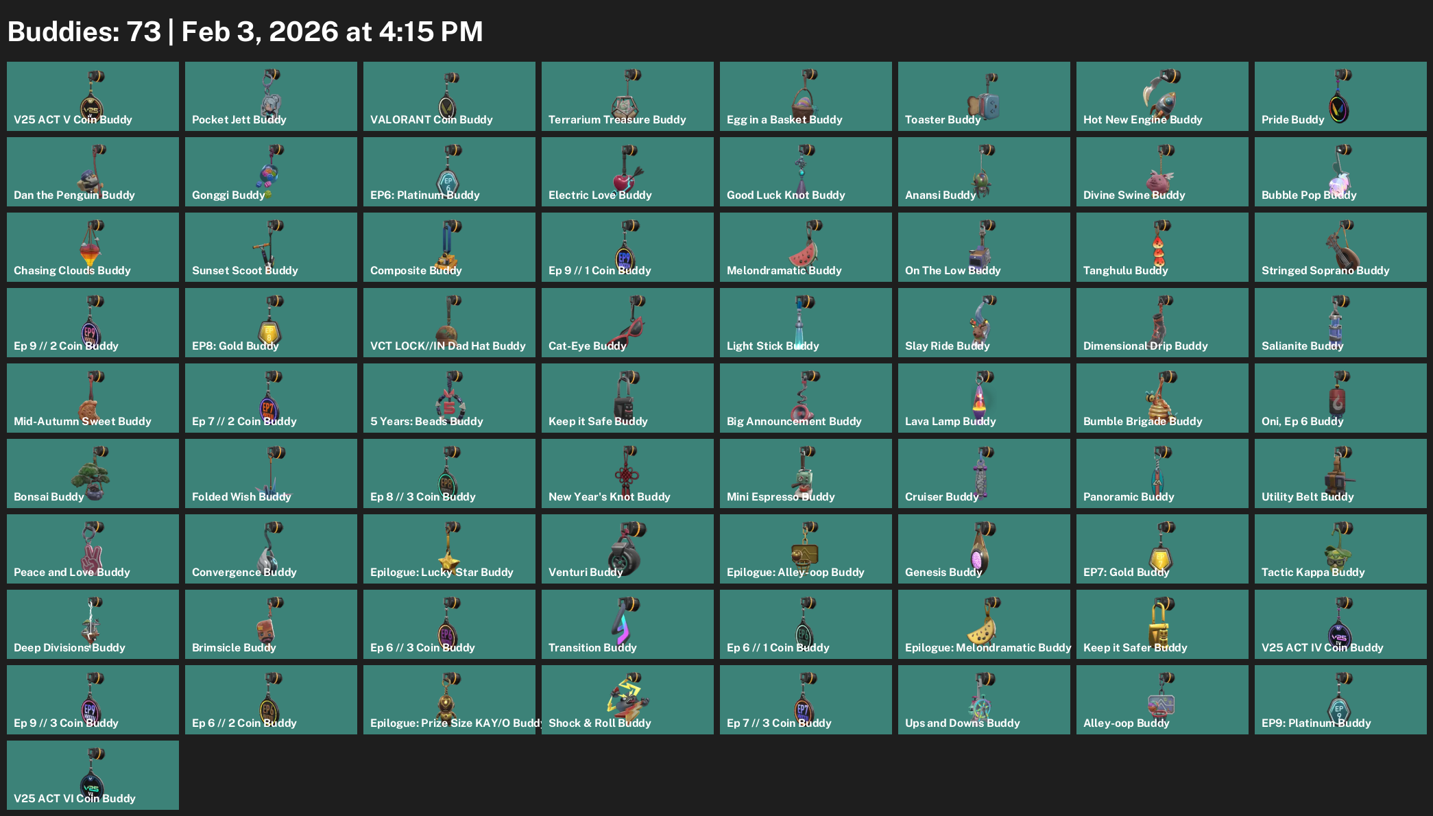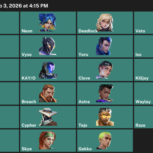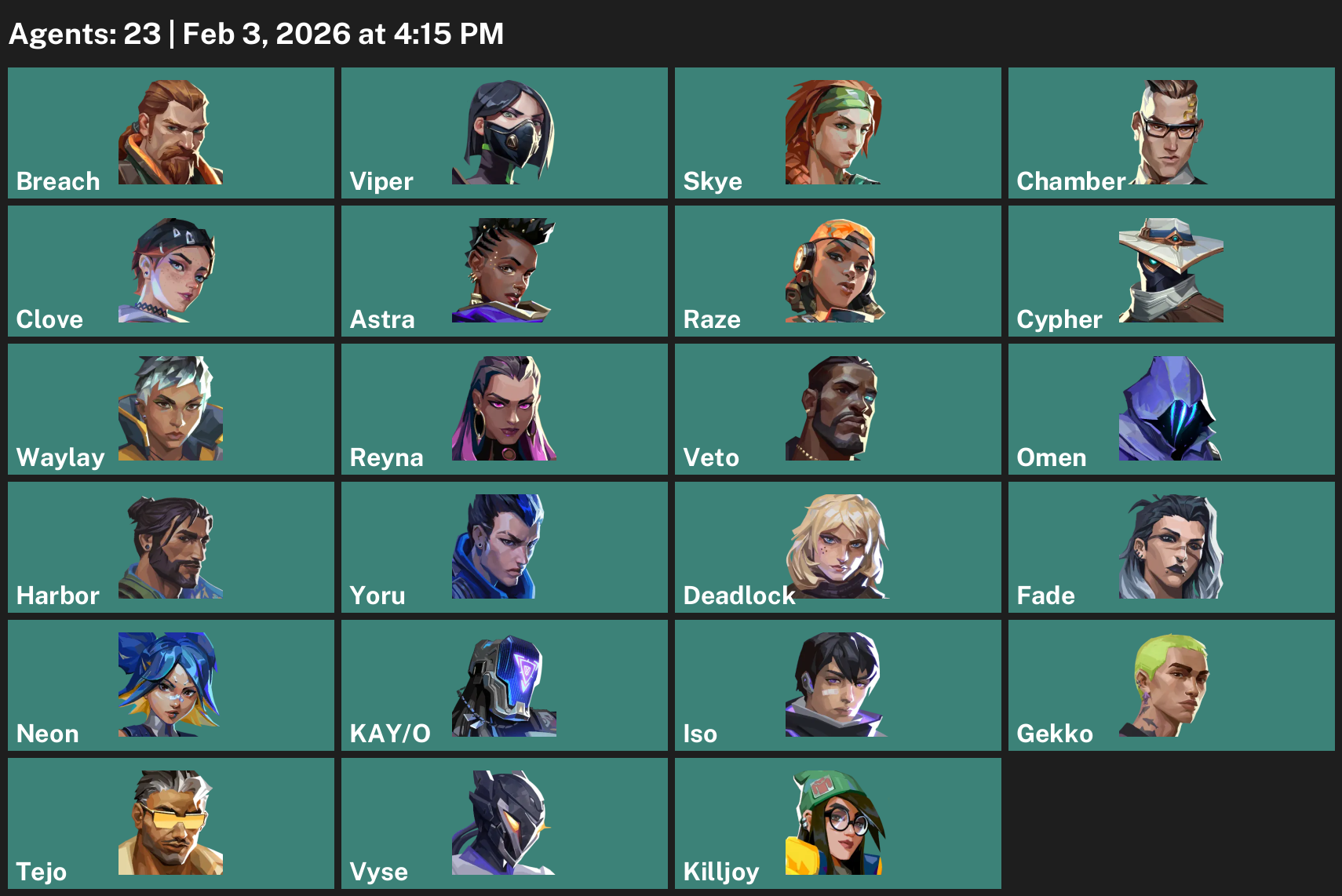 Breach, Viper, Skye, Chamber, Clove, Astra, Raze, Cypher, Waylay, Reyna, Omen, Harbor, Yoru, Deadlock, Fade, Neon, KAY/O, Iso, Gekko, Tejo, Vyse, Killjoy
