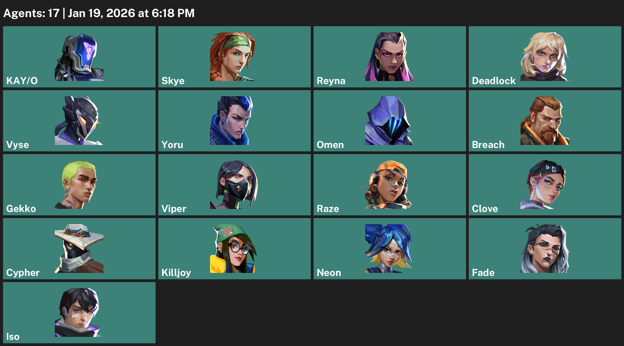 KAY/O, Skye, Reyna, Deadlock, Vyse, Yoru, Omen, Breach, Gekko, Viper, Raze, Clove, Cypher, Killjoy, Neon, Fade, Iso