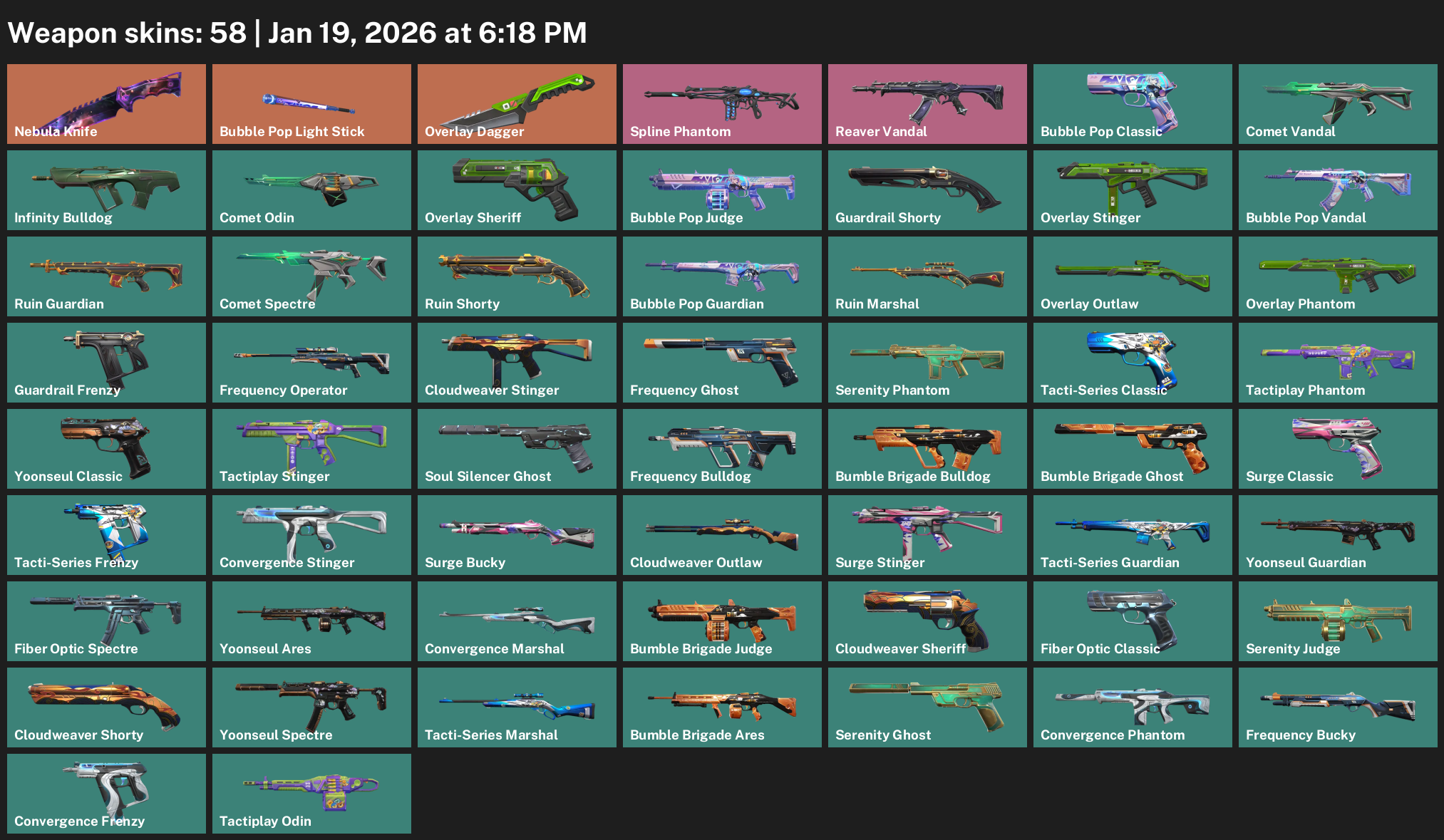 Nebula Knife, Bubble Pop Light Stick, Overlay Dagger, Spline Phantom, Reaver Vandal, Infinity Bulldog, Comet Odin, Guardrail Shorty, Ruin Guardian, Frequency Operator, Cloudweaver Stinger