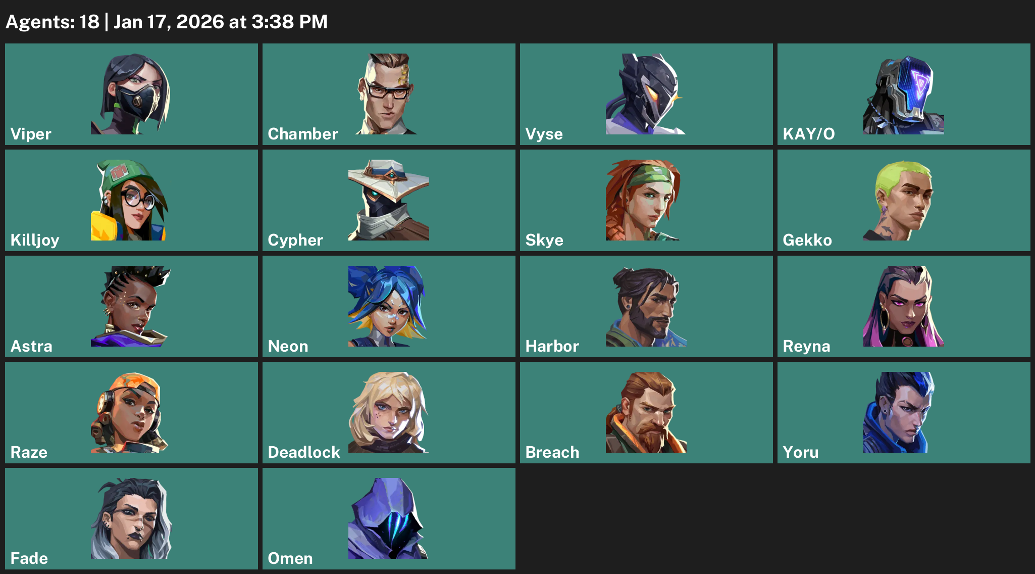 Viper, Chamber, Vyse, KAY/O, Killjoy, Cypher, Skye, Gekko, Astra, Neon, Harbor, Reyna, Raze, Deadlock, Breach, Yoru, Fade, Omen