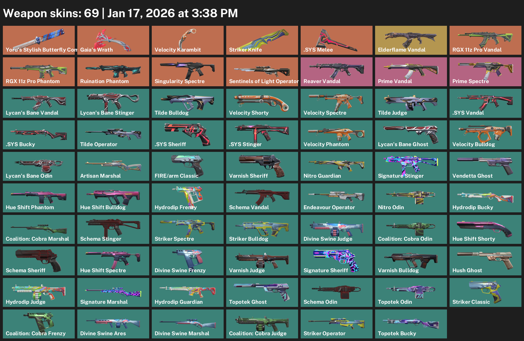 Yoru’s Stylish Butterfly Comb, Gaia’s Wrath, Velocity Karambit, Striker Knife, .SYS Melee, Elderflame Vandal, RGX 11z Pro Phantom, Singularity Spectre, Sentinels of Light Operator, Lycan’s Bane Stinger, Tilde Bulldog