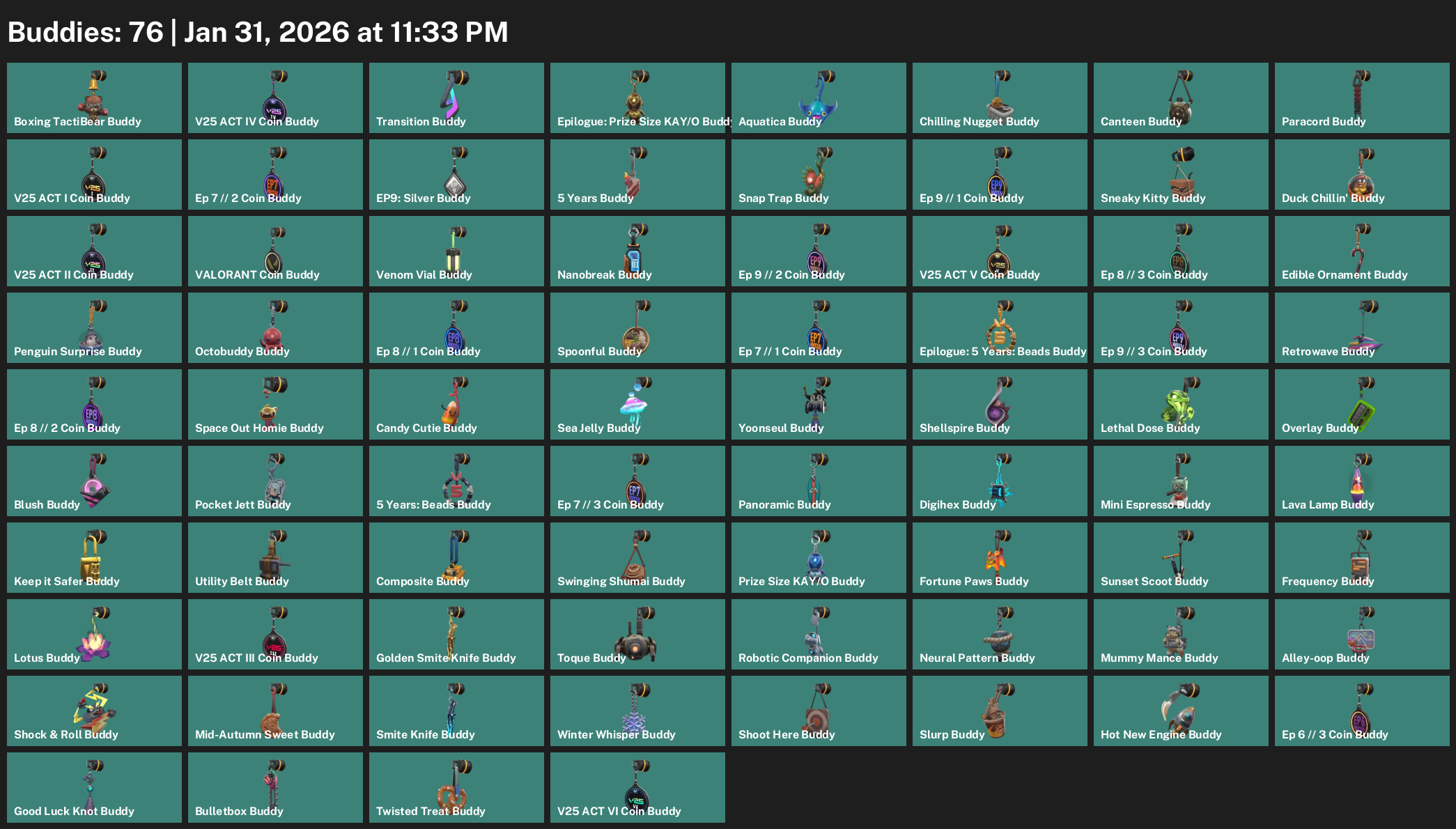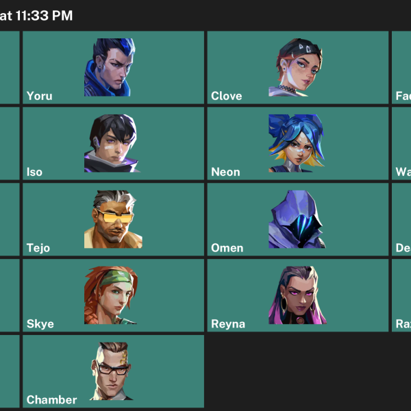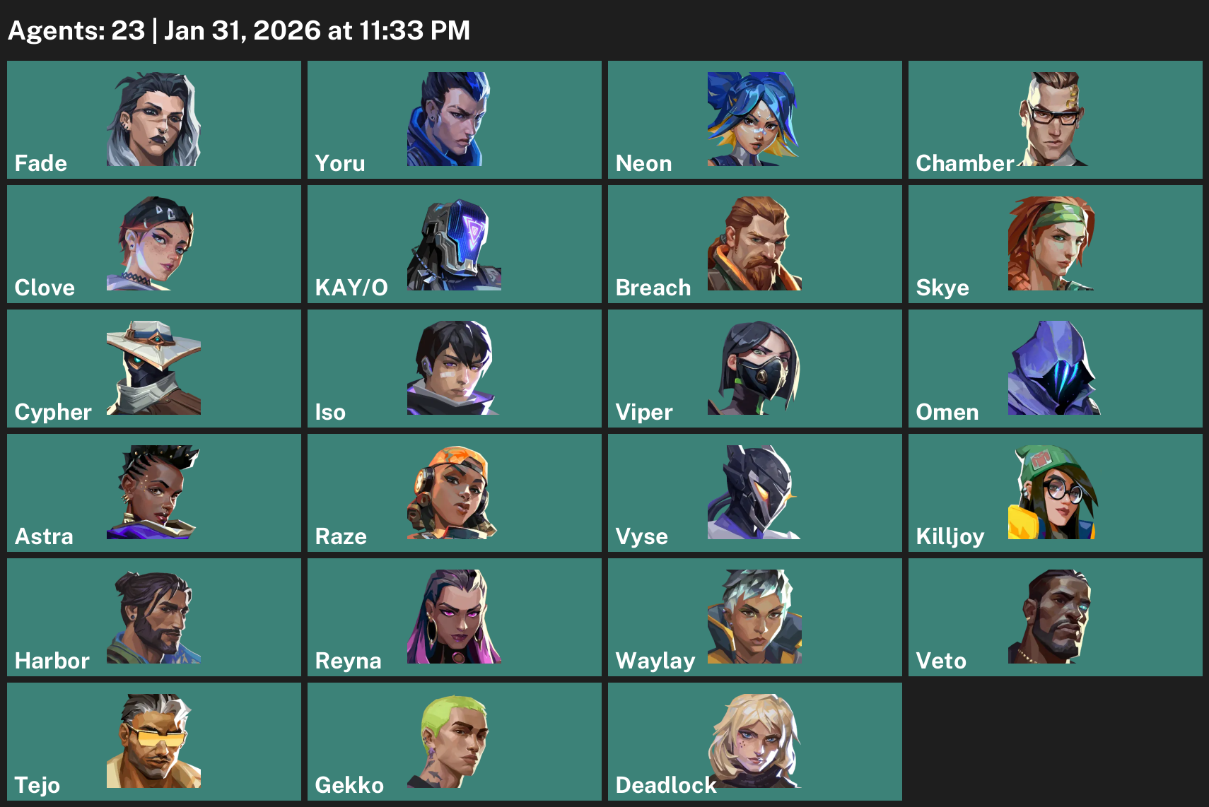 Fade, Yoru, Neon, Chamber, Clove, KAY/O, Breach, Skye, Cypher, Iso, Viper, Omen, Astra, Raze, Vyse, Killjoy, Harbor, Reyna, Waylay, Tejo, Gekko, Deadlock