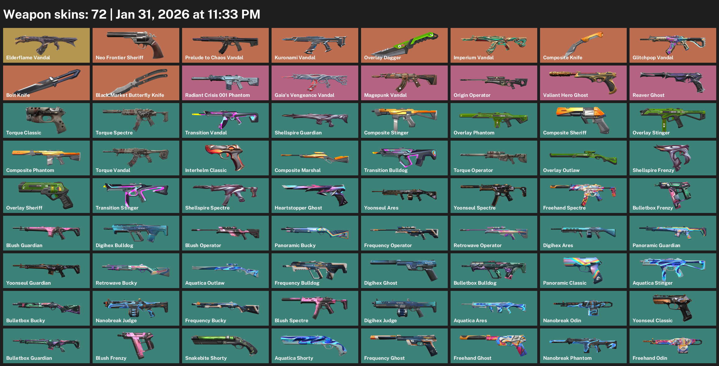 Elderflame Vandal, Neo Frontier Sheriff, Overlay Dagger, Composite Knife, Radiant Crisis 001 Phantom, Origin Operator, Valiant Hero Ghost, Torque Classic, Shellspire Guardian