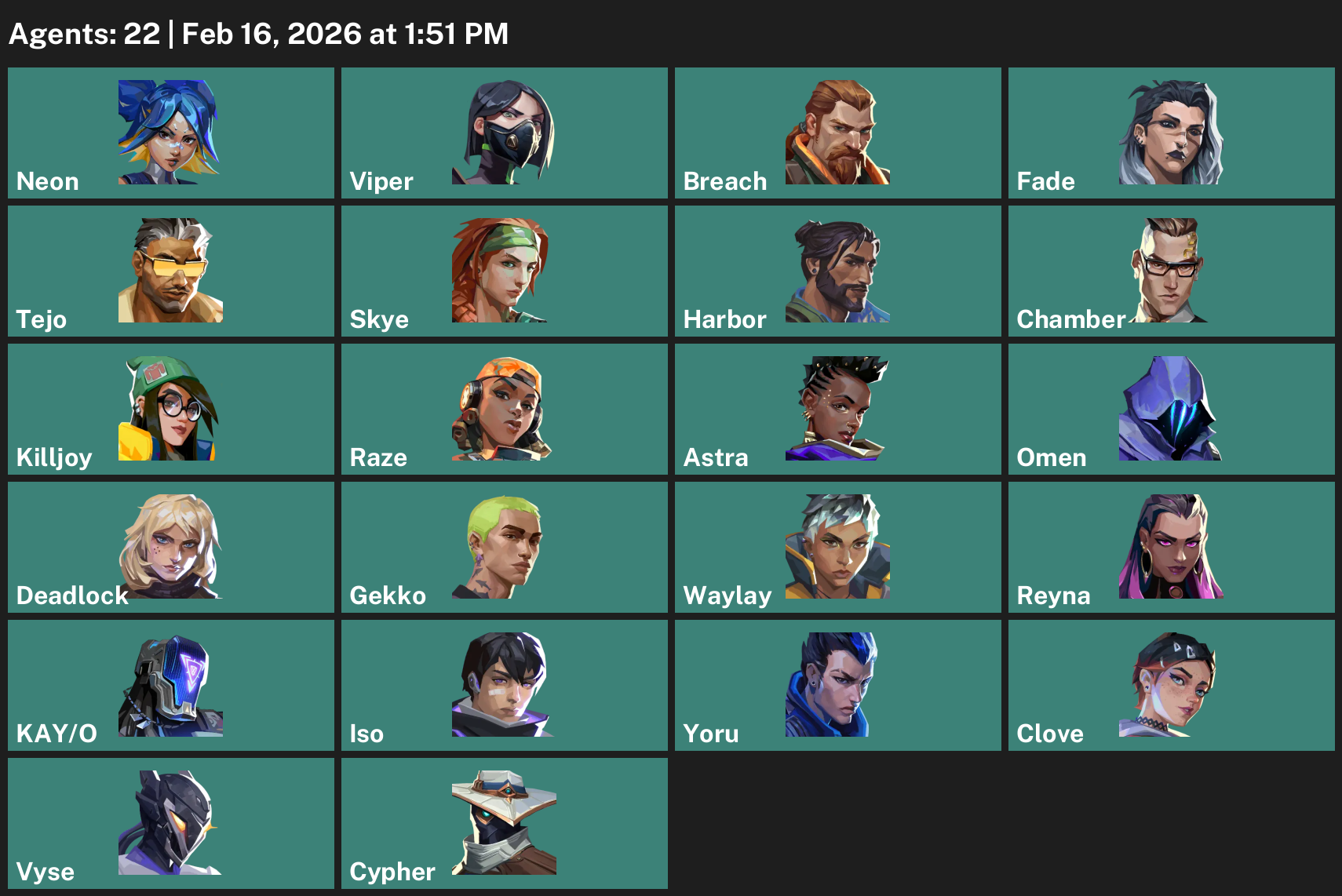 Neon, Viper, Breach, Fade, Tejo, Skye, Harbor, Chamber, Killjoy, Raze, Astra, Omen, Deadlock, Gekko, Waylay, Reyna, KAY/O, Iso, Yoru, Clove, Vyse, Cypher