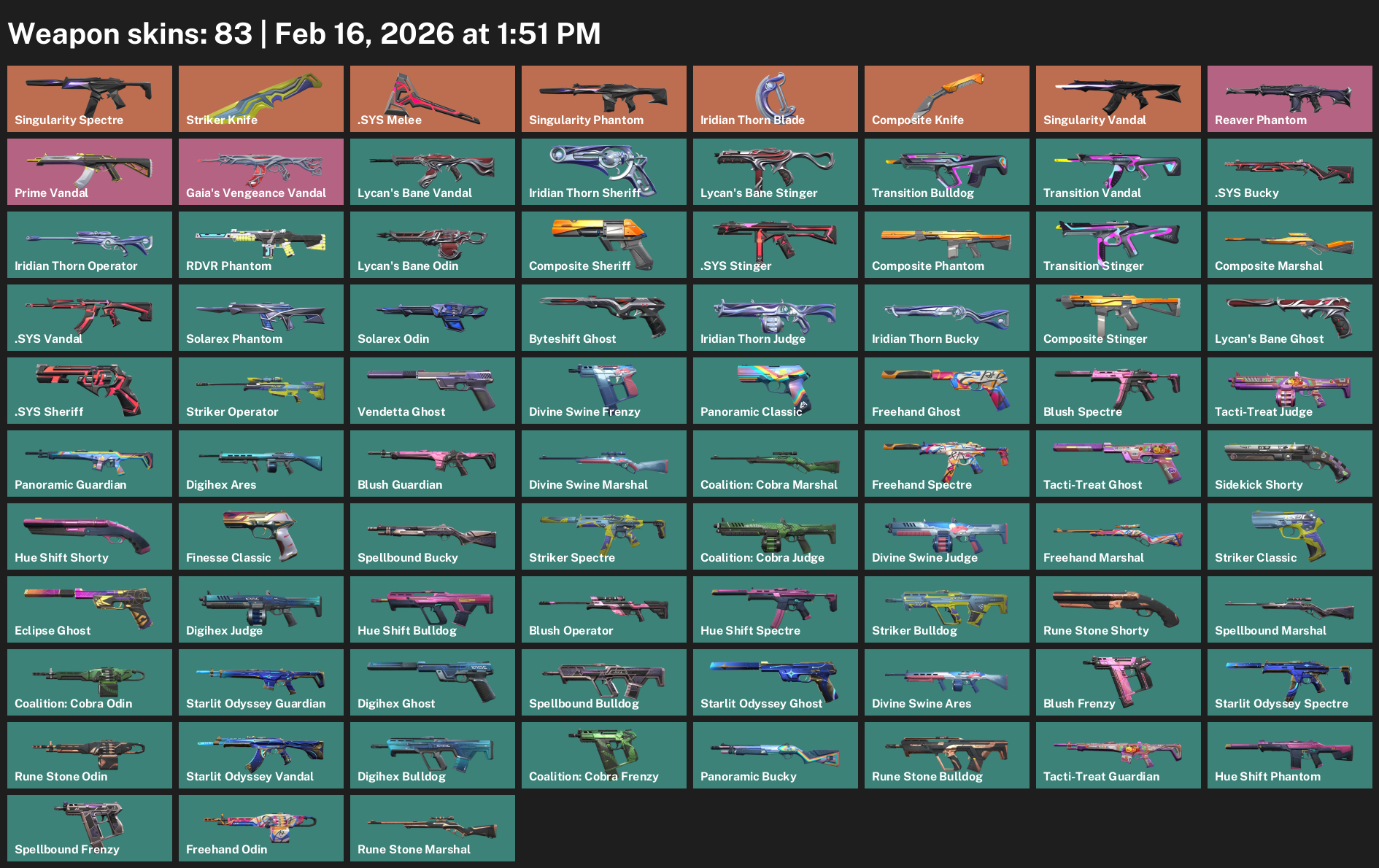 Singularity Spectre, Striker Knife, .SYS Melee, Iridian Thorn Blade, Reaver Phantom, Prime Vandal, Lycan’s Bane Stinger, Transition Bulldog, Composite Sheriff