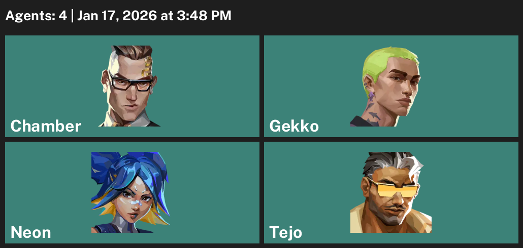 Chamber, Gekko, Neon, Tejo