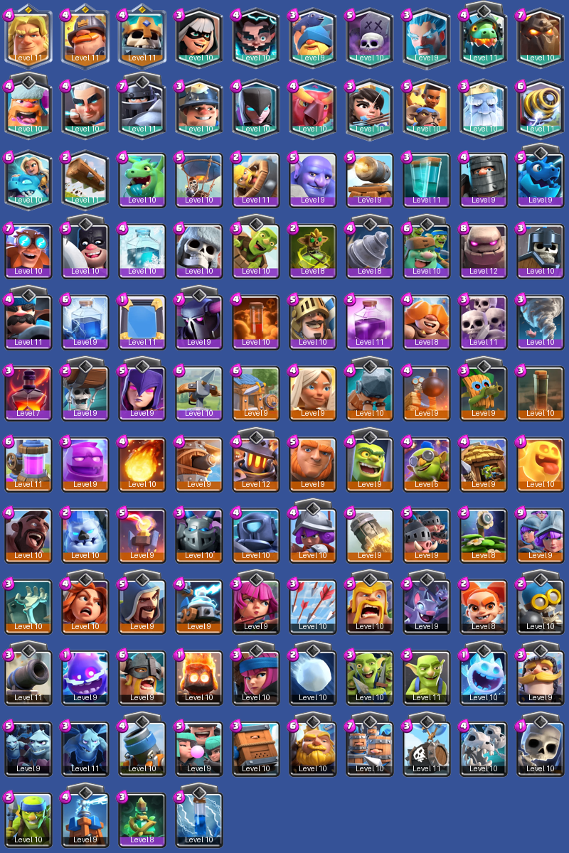 Epics: Pekka, Balloon, Witch, Golem, SkeletonArmy, BabyDragon, Prince, GiantSkeleton, SkeletonWarriors, DarkPrince, Bowler, Hunter, AxeMan, MovingCannon, Wallbreakers, GoblinGiant, ElectroDragon, ElectroGiant, GiantBuffer, Xbow, GoblinDrill, Rage, GoblinBarrel, Freeze, Mirror, Lightning, Poison, Tornado, Clone, BarbLog, DarkMagic, GoblinCurse