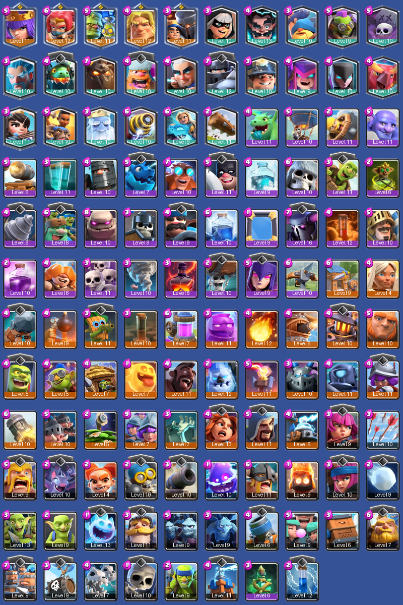 Epics: Balloon, Witch, Golem, SkeletonArmy, BabyDragon, Prince, GiantSkeleton, SkeletonWarriors, DarkPrince, Bowler, Hunter, AxeMan, MovingCannon, Wallbreakers, GoblinGiant, ElectroDragon, ElectroGiant, GiantBuffer, Xbow, GoblinDrill, Rage, GoblinBarrel, Freeze, Mirror, Lightning, Poison, Tornado, Clone, BarbLog, DarkMagic, GoblinCurse