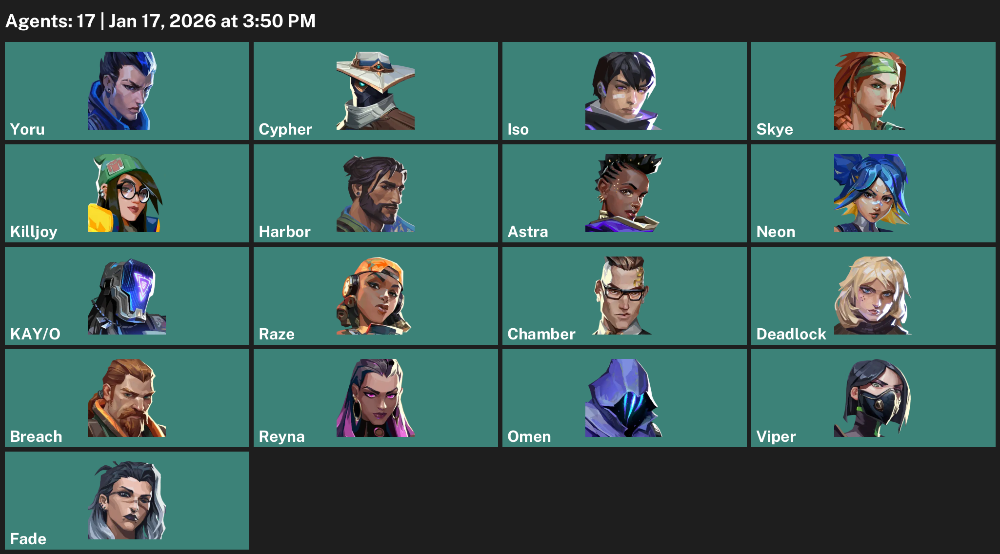 Yoru, Cypher, Iso, Skye, Killjoy, Harbor, Astra, Neon, KAY/O, Raze, Chamber, Deadlock, Breach, Reyna, Omen, Viper, Fade