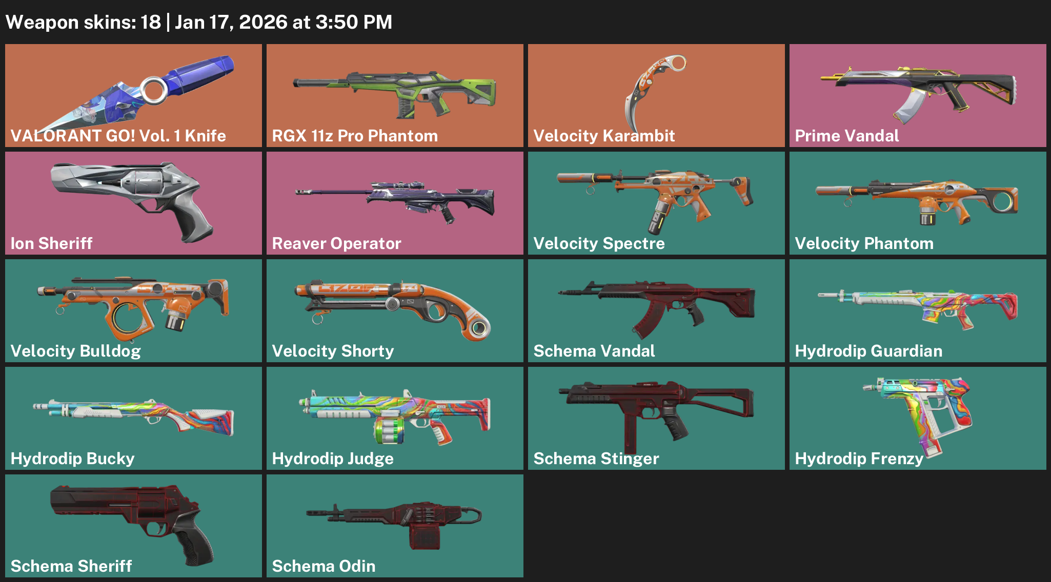 VALORANT GO! Vol. 1 Knife, RGX 11z Pro Phantom, Velocity Karambit, Prime Vandal, Ion Sheriff, Reaver Operator, Hydrodip Guardian, Schema Stinger