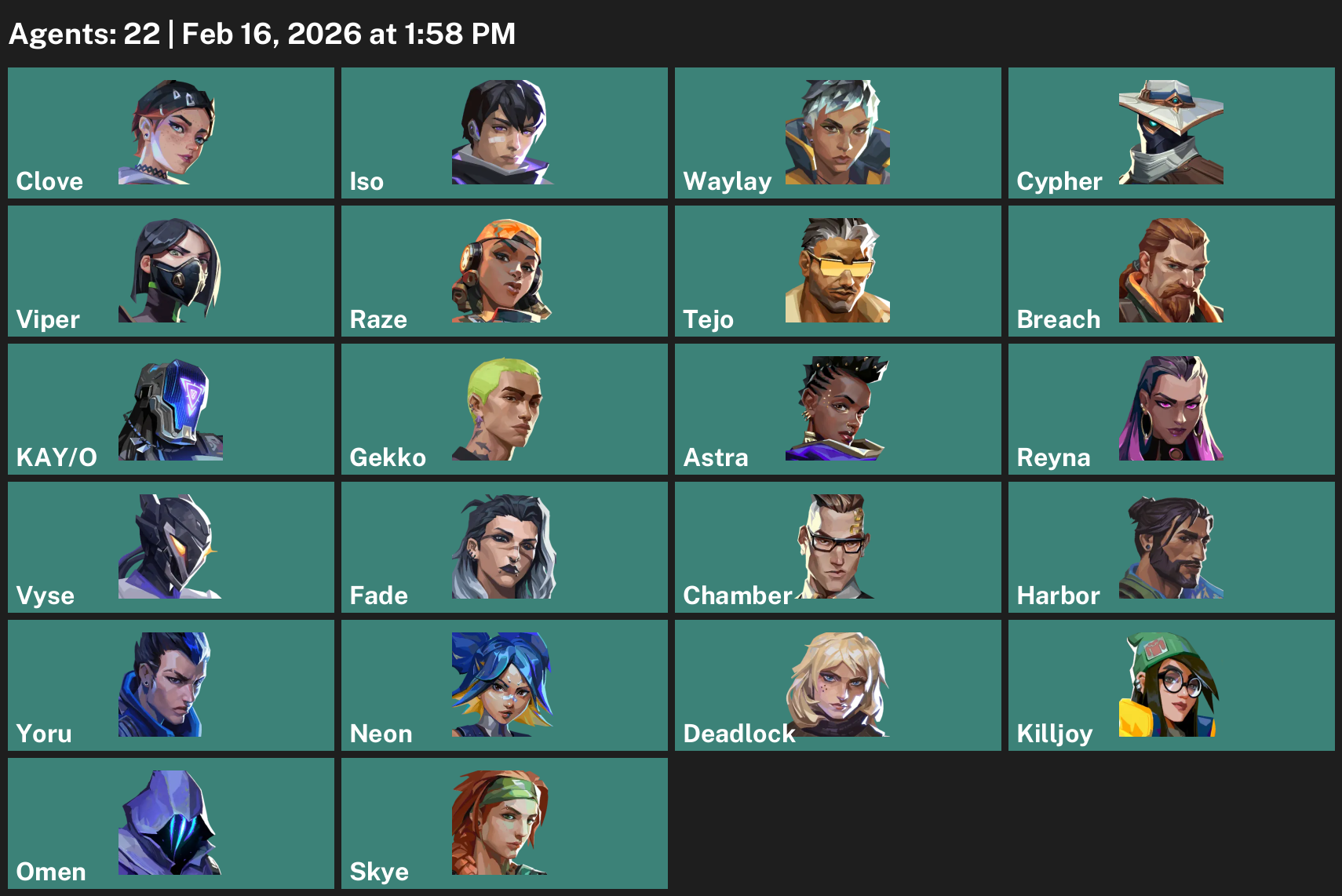 Clove, Iso, Waylay, Cypher, Viper, Raze, Tejo, Breach, KAY/O, Gekko, Astra, Reyna, Vyse, Fade, Chamber, Harbor, Yoru, Neon, Deadlock, Killjoy, Omen, Skye