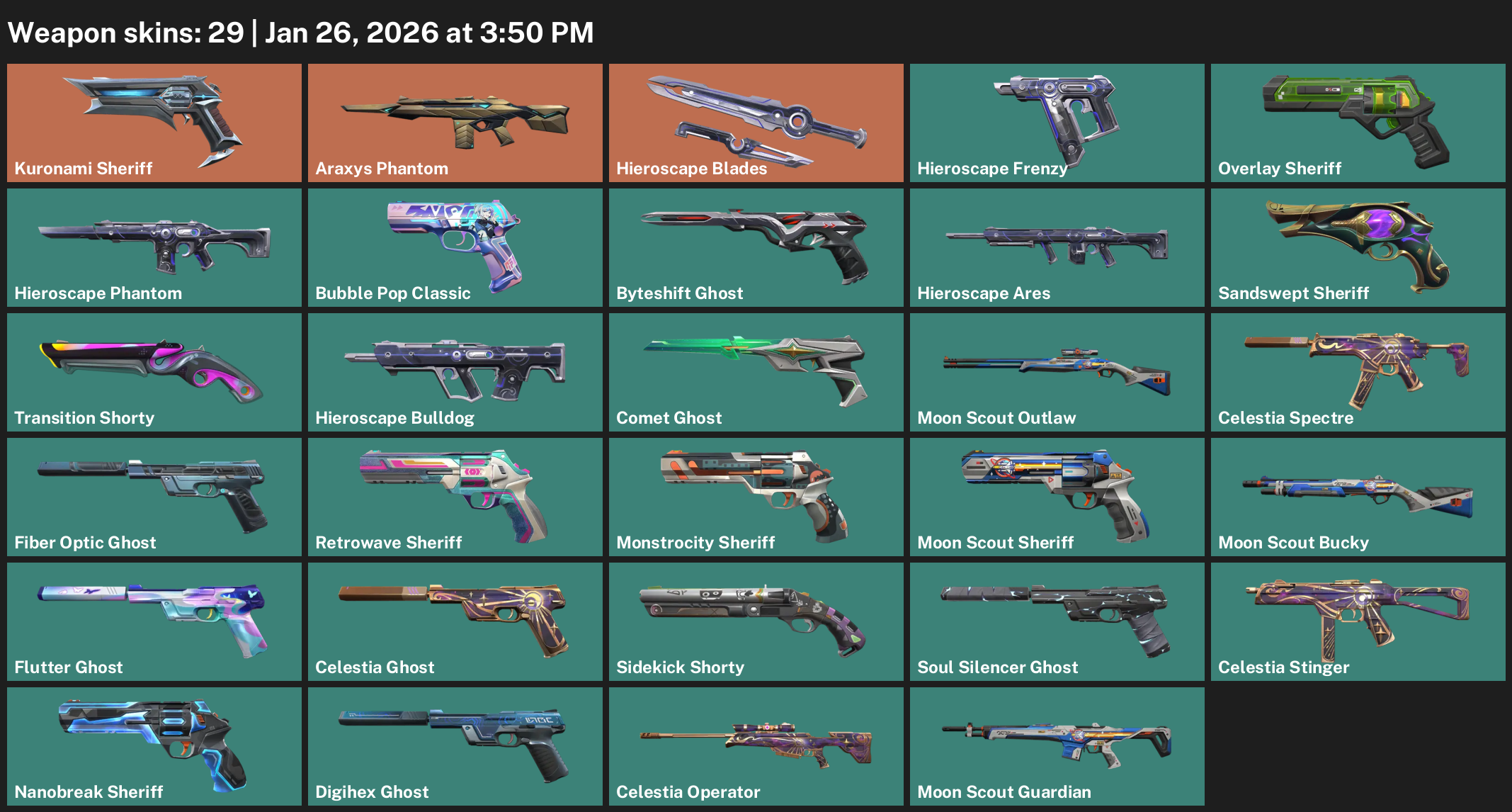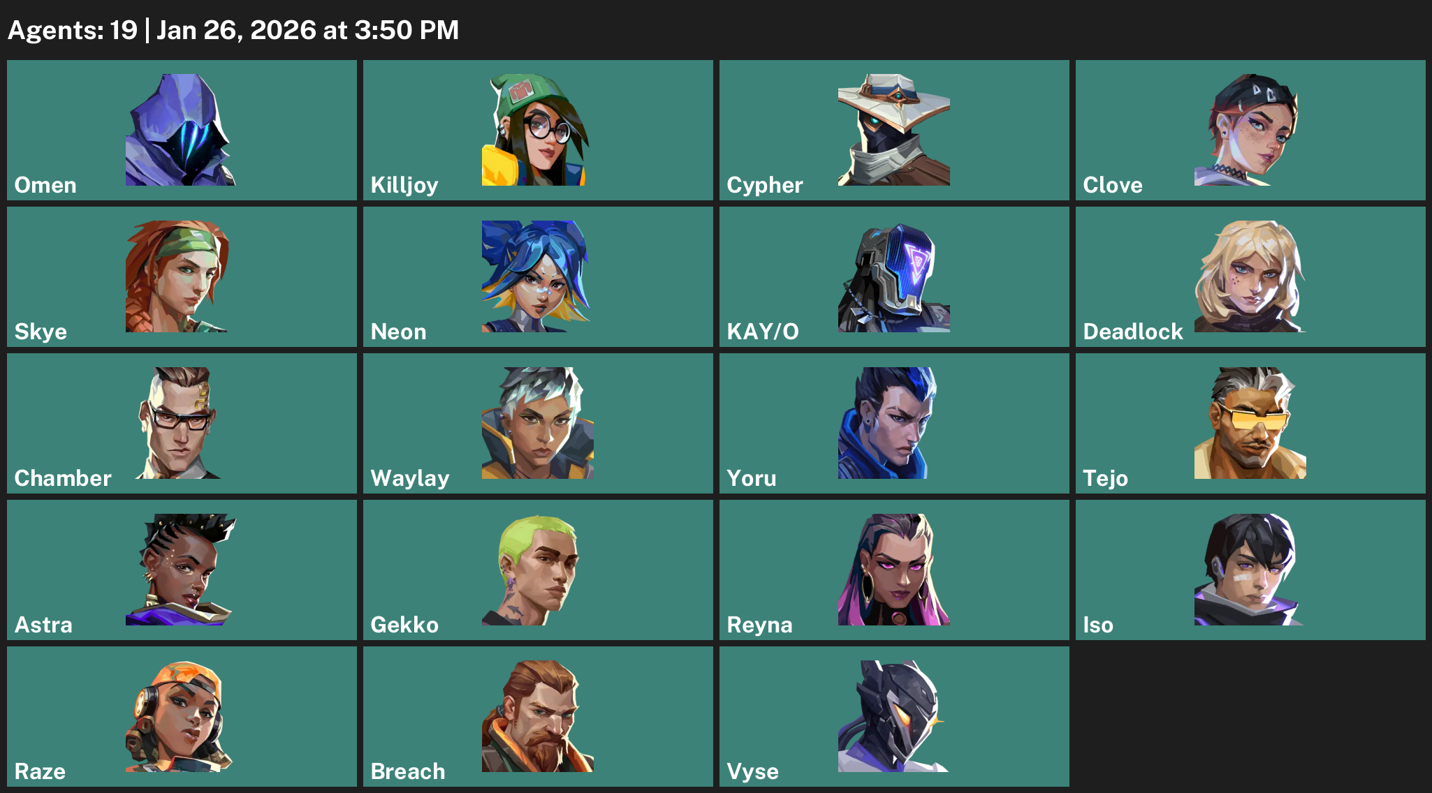 Omen, Killjoy, Cypher, Clove, Skye, Neon, KAY/O, Deadlock, Chamber, Waylay, Yoru, Tejo, Astra, Gekko, Reyna, Iso, Raze, Breach, Vyse