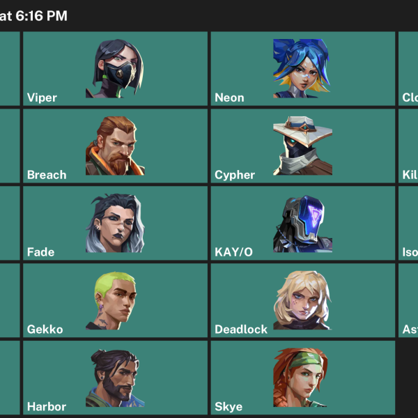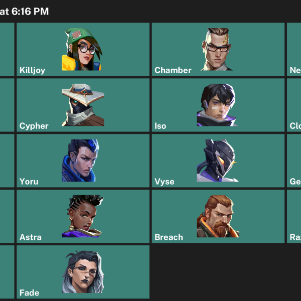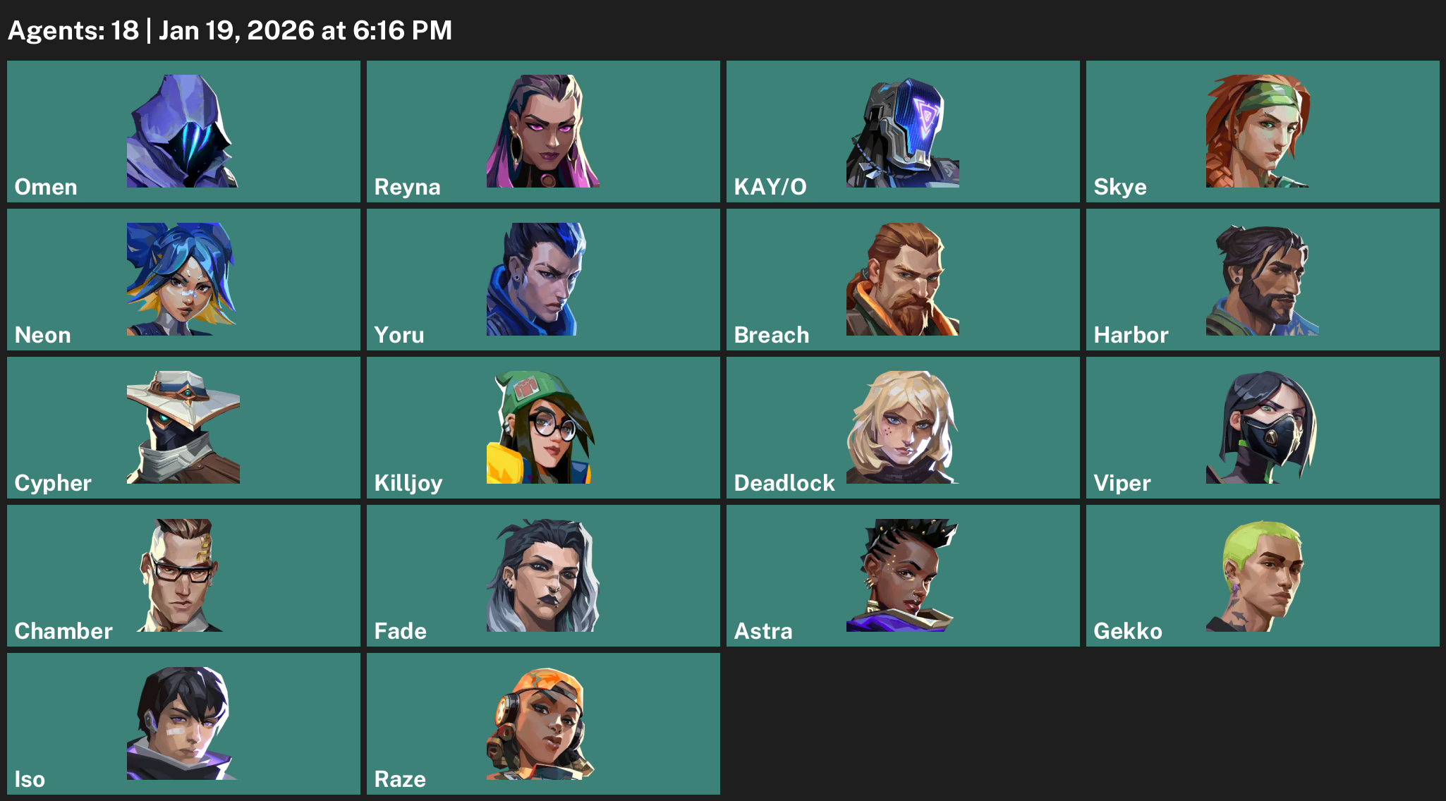 Omen, Reyna, KAY/O, Skye, Neon, Yoru, Breach, Harbor, Cypher, Killjoy, Deadlock, Viper, Chamber, Fade, Astra, Gekko, Iso, Raze