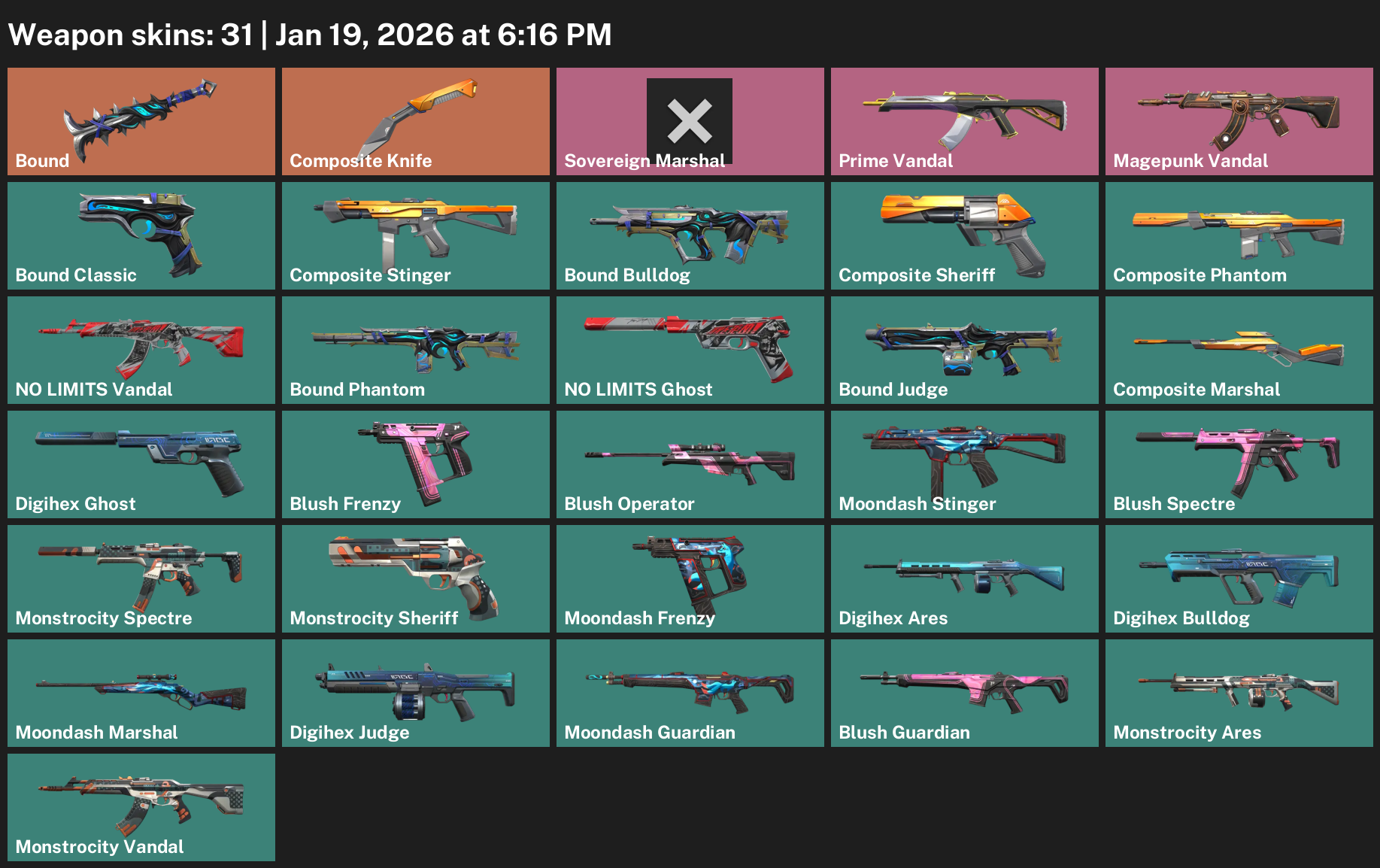 Bound , Composite Knife, Sovereign Marshal, Prime Vandal, NO LIMITS Ghost, Blush Frenzy, Moondash Stinger, Monstrocity Spectre, Digihex Ares