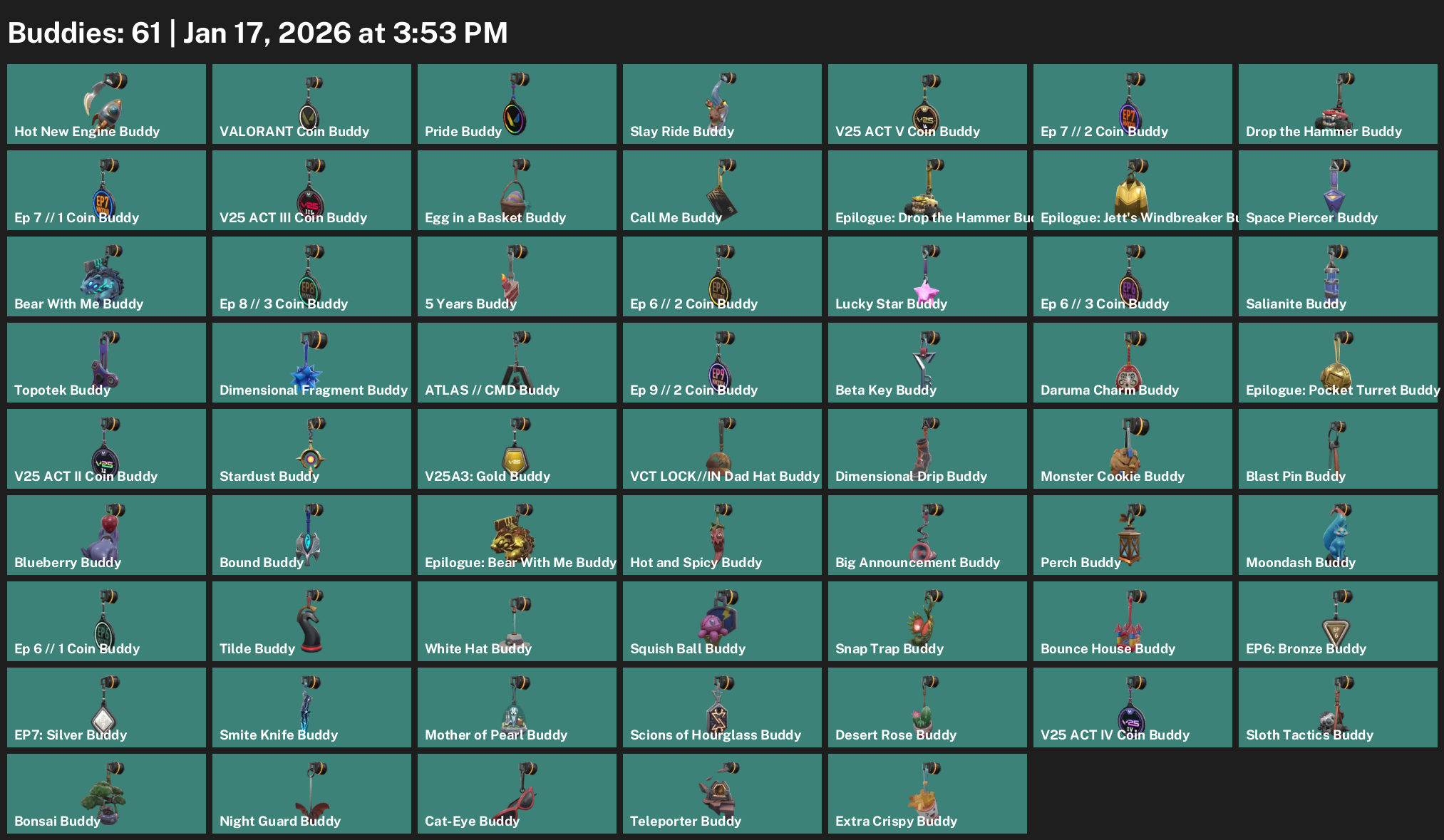 Clove, Neon, Gekko, Killjoy, Chamber, Reyna, Yoru, Breach, Waylay, Fade, KAY/O, Harbor, Viper, Skye, Deadlock, Iso, Cypher, Vyse, Raze, Astra, Omen, Tejo