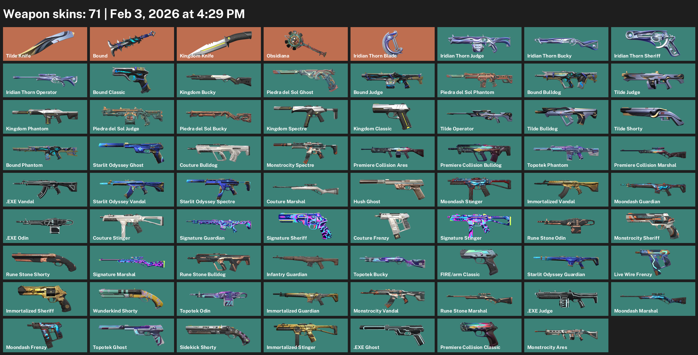 LA | 71 Skins | exp SILVER 2 | Tilde Knife | Immortalized Vandal | .EXE Vandal | Monstrocity Vandal | Starlit Odyssey Vandal | #ZHO5440