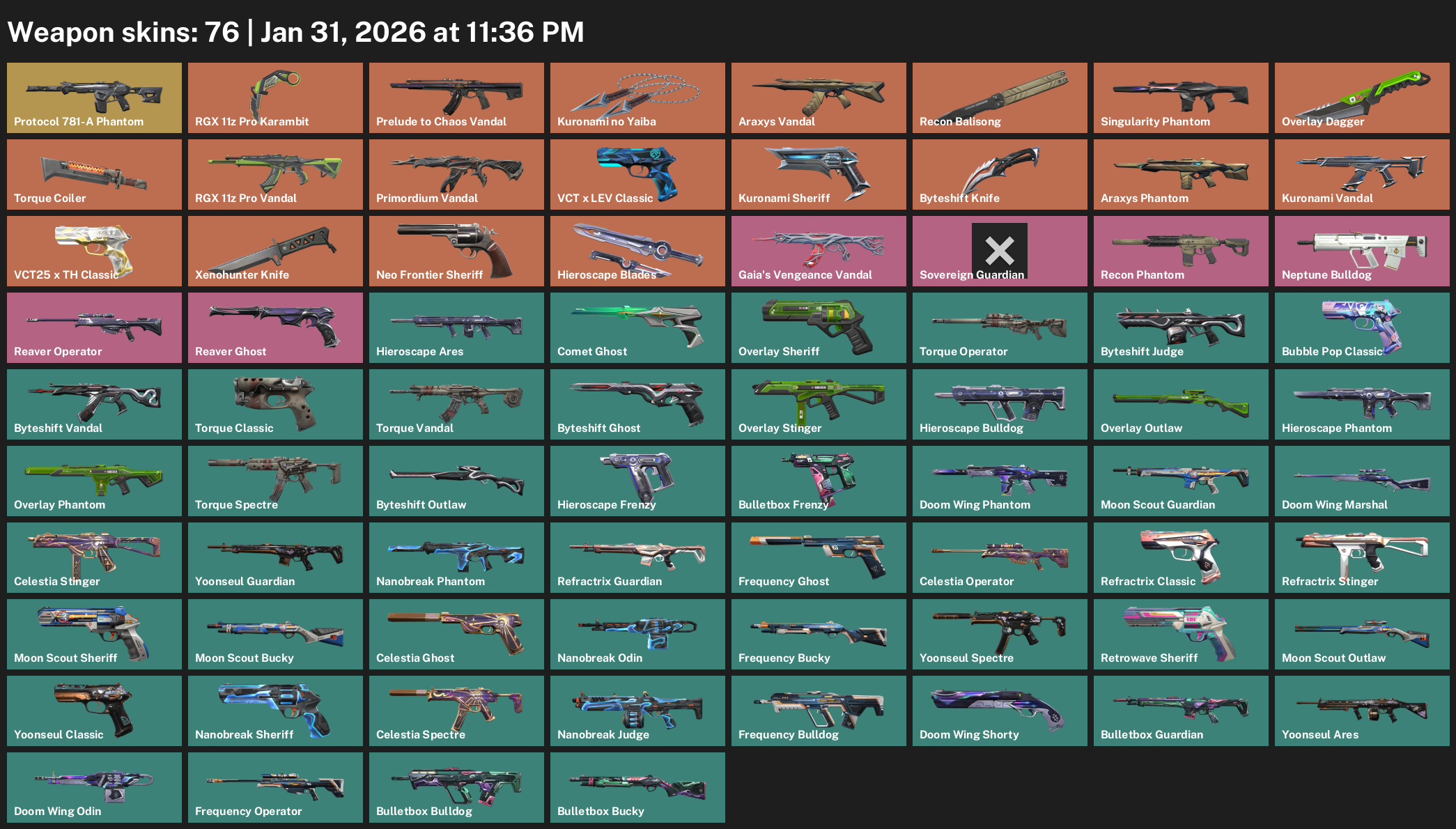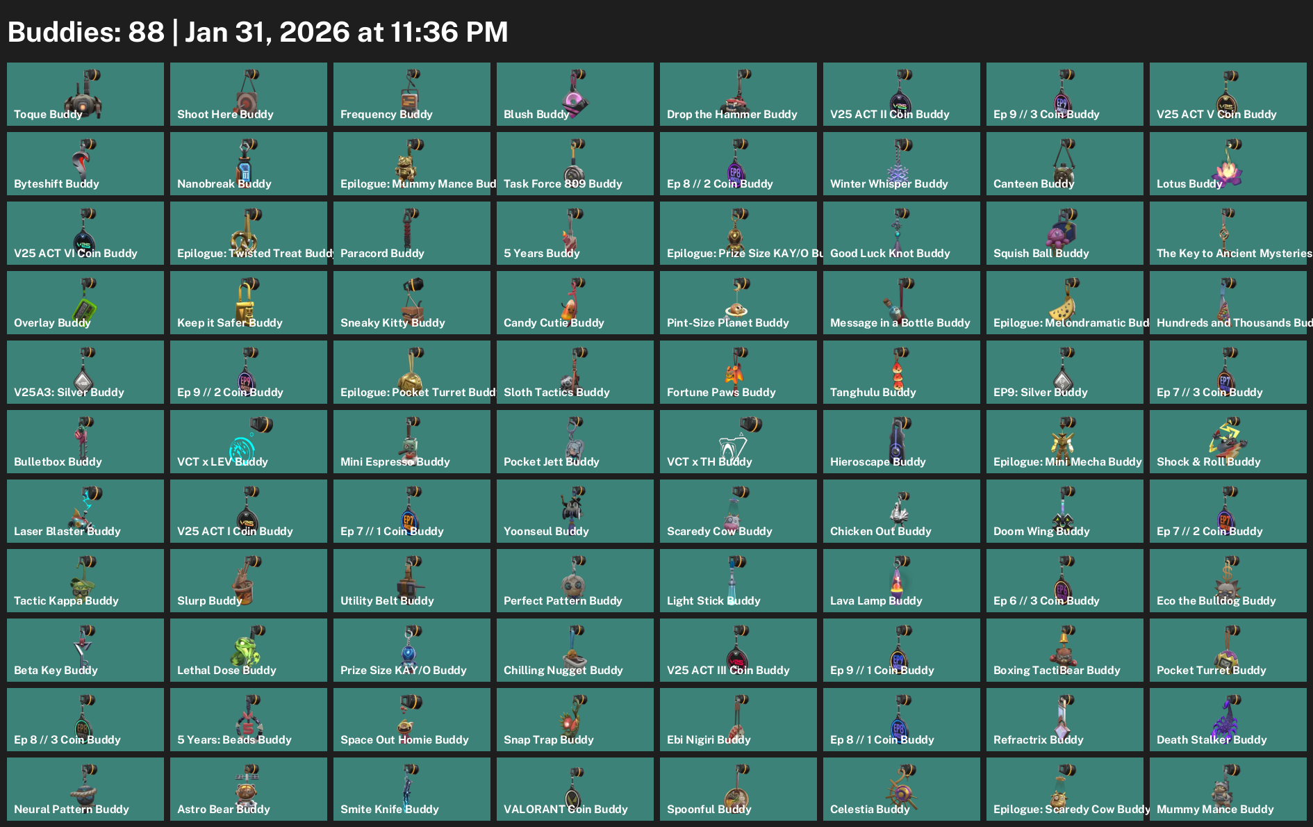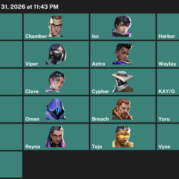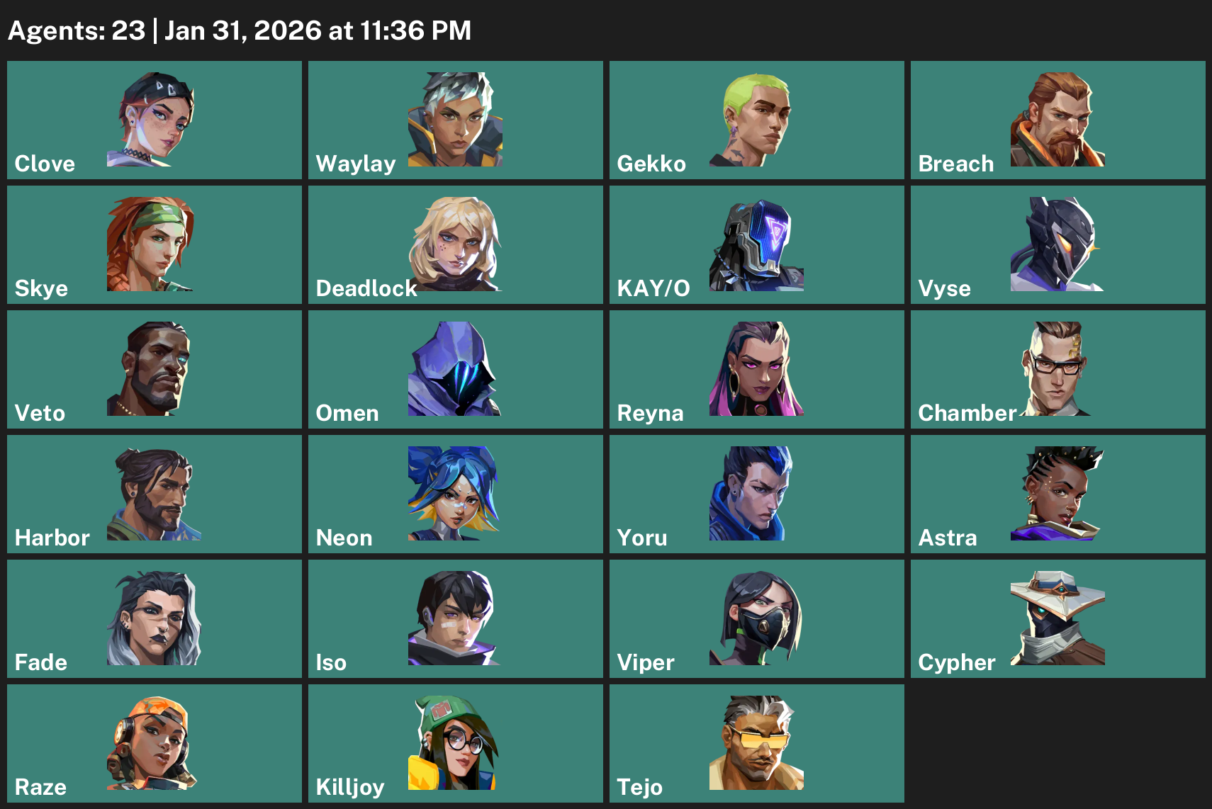 Clove, Waylay, Gekko, Breach, Skye, Deadlock, KAY/O, Vyse, Omen, Reyna, Chamber, Harbor, Neon, Yoru, Astra, Fade, Iso, Viper, Cypher, Raze, Killjoy, Tejo