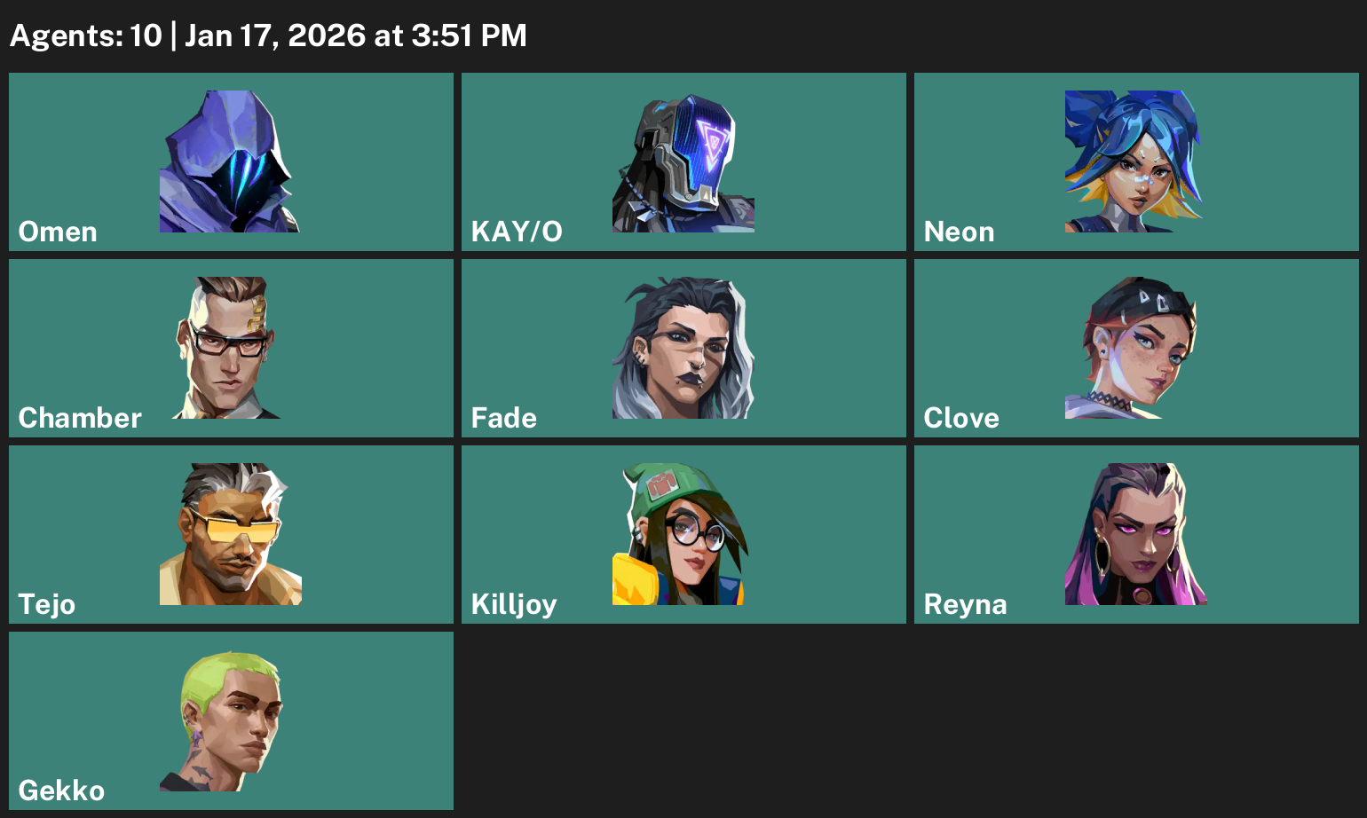 Omen, KAY/O, Neon, Chamber, Fade, Clove, Tejo, Killjoy, Reyna, Gekko