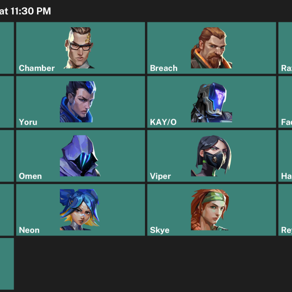 Neon, Killjoy, Cypher, KAY/O, Omen, Astra, Harbor, Raze, Deadlock, Skye, Chamber, Yoru, Viper, Gekko, Breach, Fade, Reyna