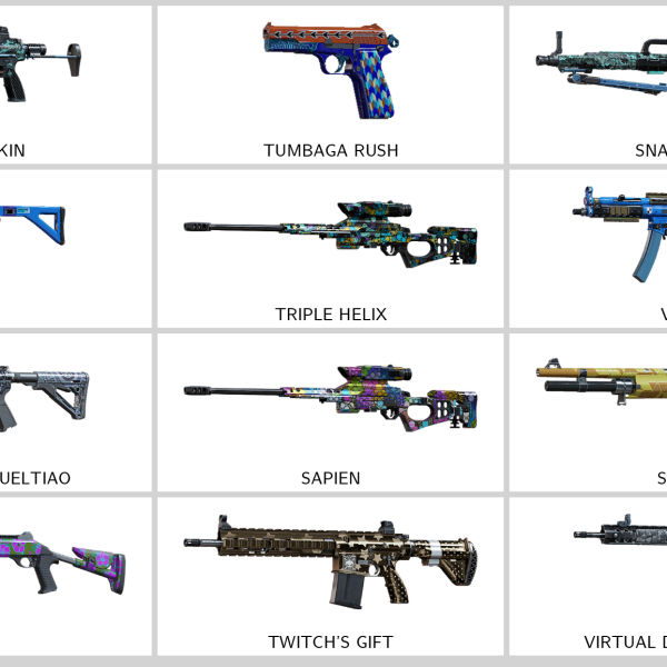 – Intergalactic Cannon (AUG A2), Ferocious Green (MP7), Shredded Rifts (FMG-9), Pearl Ripple (M590A1)