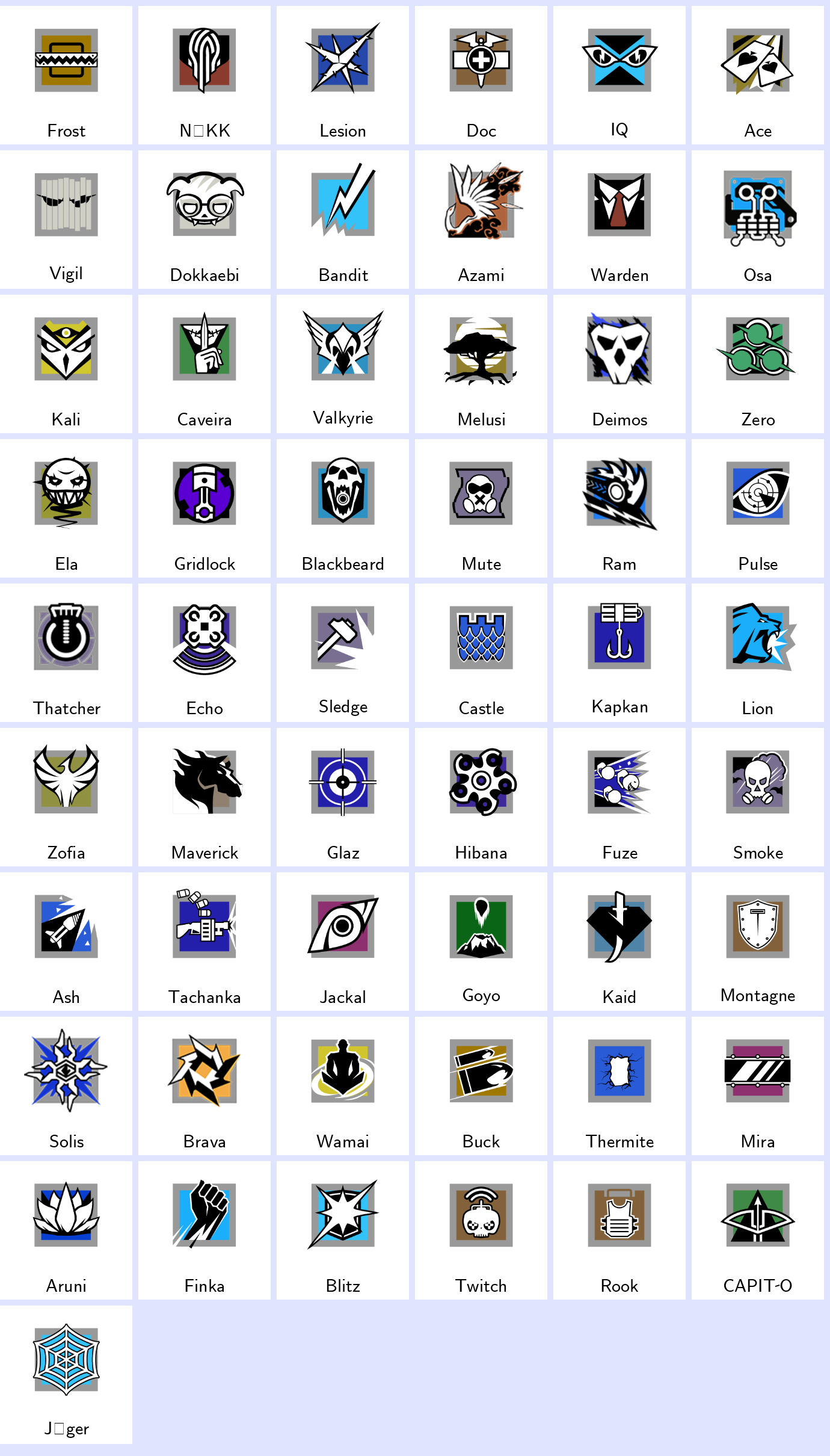 Some Operators: , Hibana, Pulse, Vigil, Lion, Aruni, Ela, Lesion, Tachanka, Castle, Sledge, Kali, Ram, Zero, Smoke, Jackal, Mira, Capitao, Jager, Ace, Frost, Deimos, Gridlock, Twitch, Dokkaebi, Kaid, Wamai, Buck, Ash, Echo, Melusi, Iq, Valkyrie, Thermite, Montagne, Kapkan, Finka, Blitz, Azami, Goyo, Nokk, Glaz, Warden, Caveira, Solis, Rook, Mute, Bandit, Blackbeard, Zofia, Brava, Fuze, Osa, Thatcher, Doc, Maverick