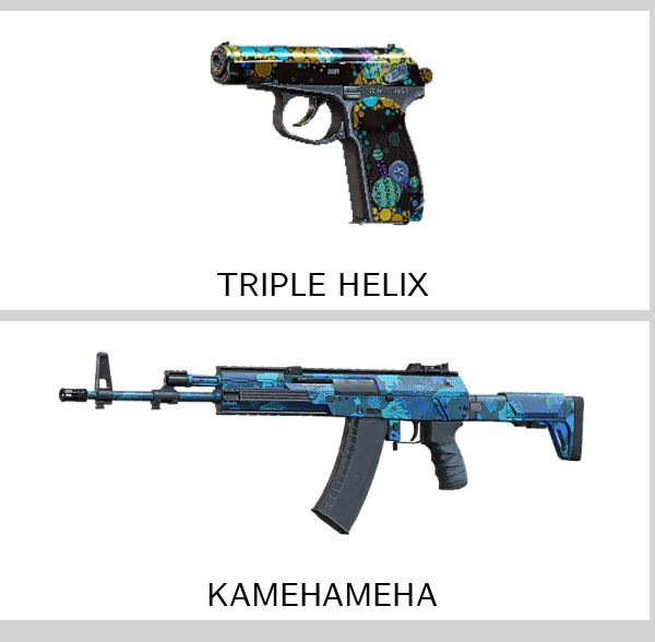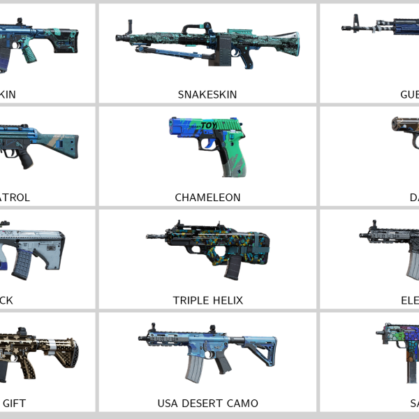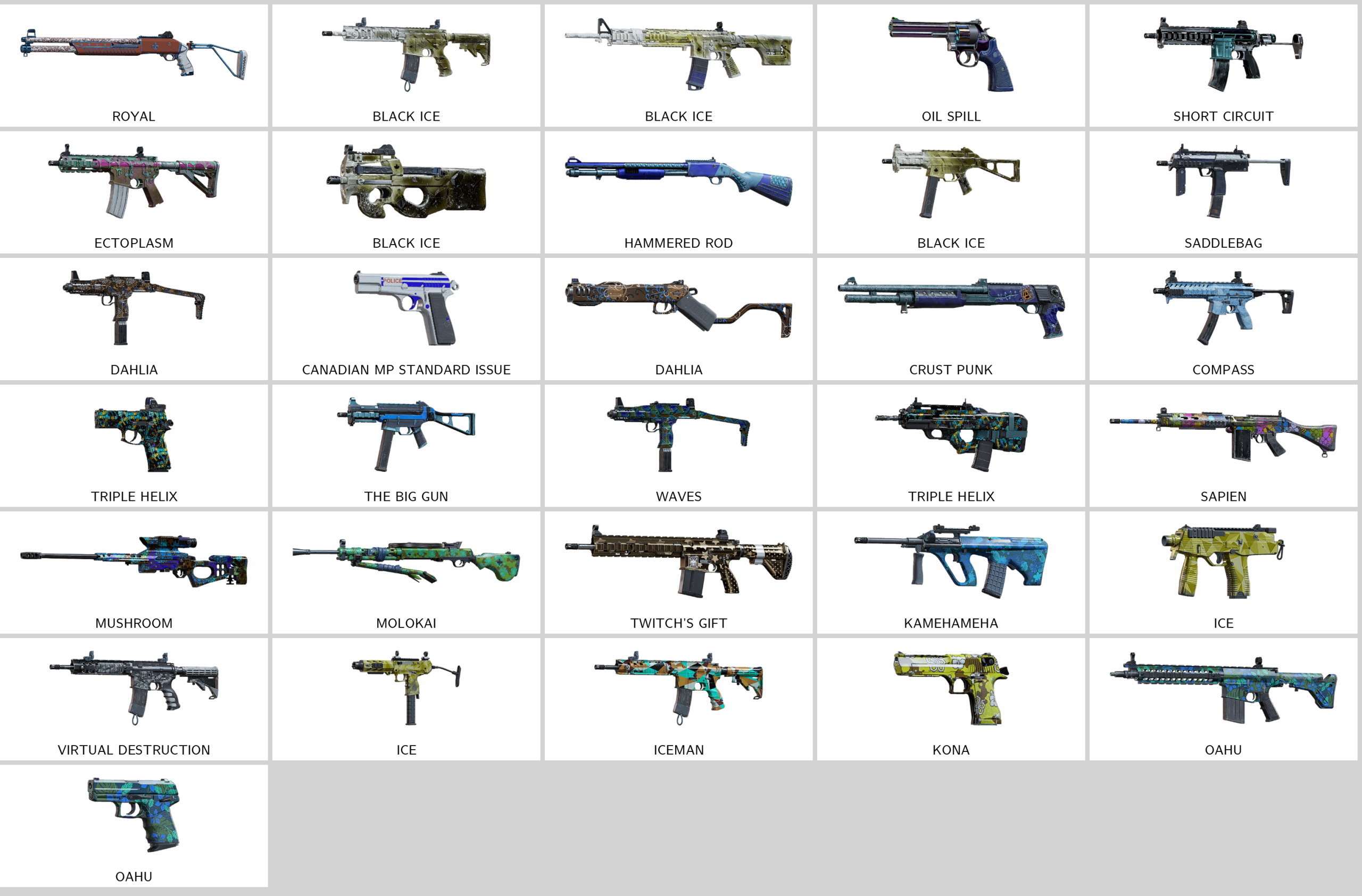 Some Skins: Ectoplasm, Crust Punk, The Big Gun, Triple Helix, Oahu, Kamehameha, Waves, Black Ice, Iceman, Kona, Saddlebag, Dahlia, Oil Spill, Virtual Destruction, Twitch’S Gift, Sapien, Short Circuit, Molokai, Canadian Mp Standard Issue, Compass, Hammered Rod, Ice, Royal, Mushroom
