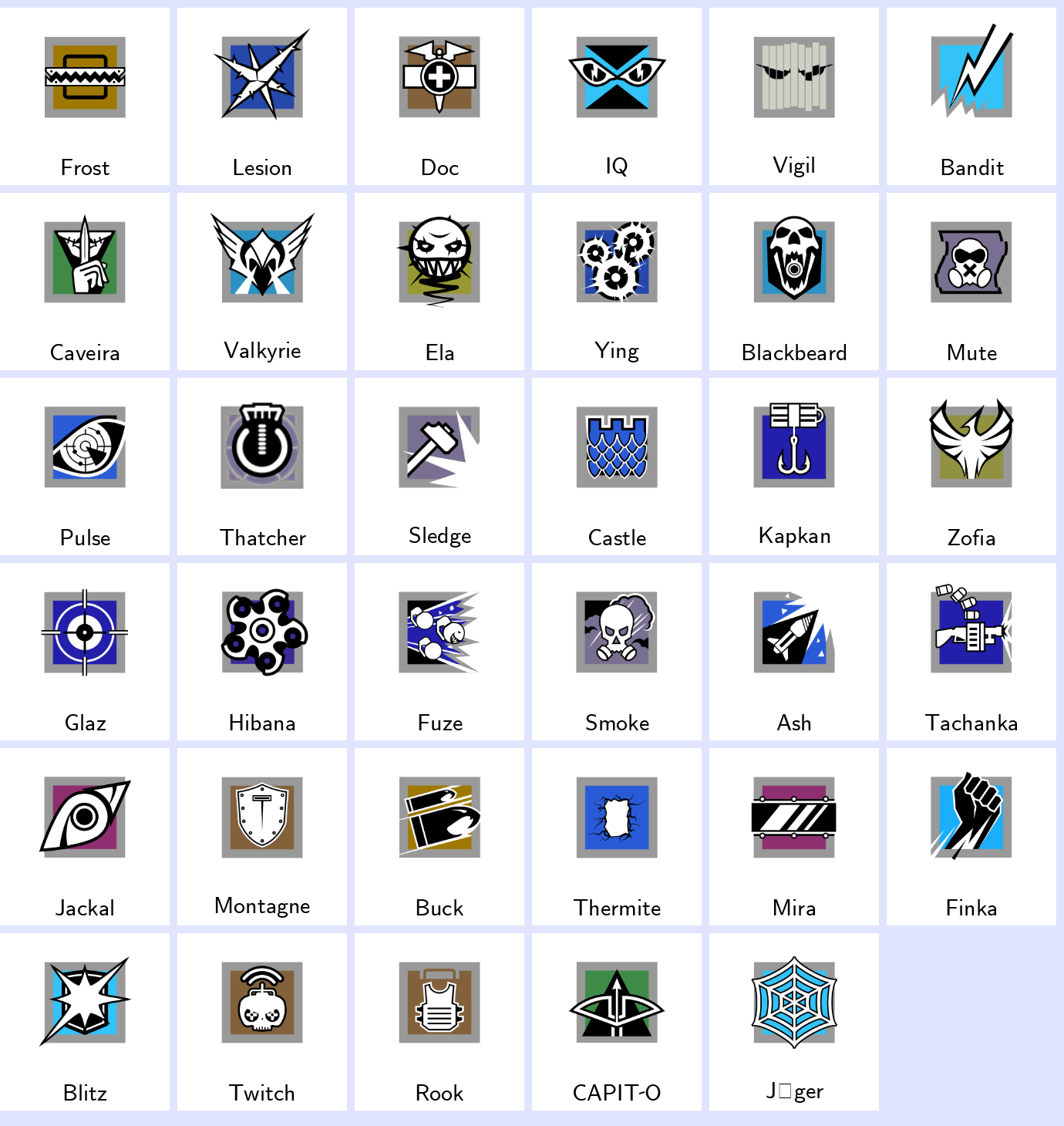 Some Operators: Frost, Lesion, Doc, Iq, Vigil, Bandit, Caveira, Valkyrie, Ela, Ying…