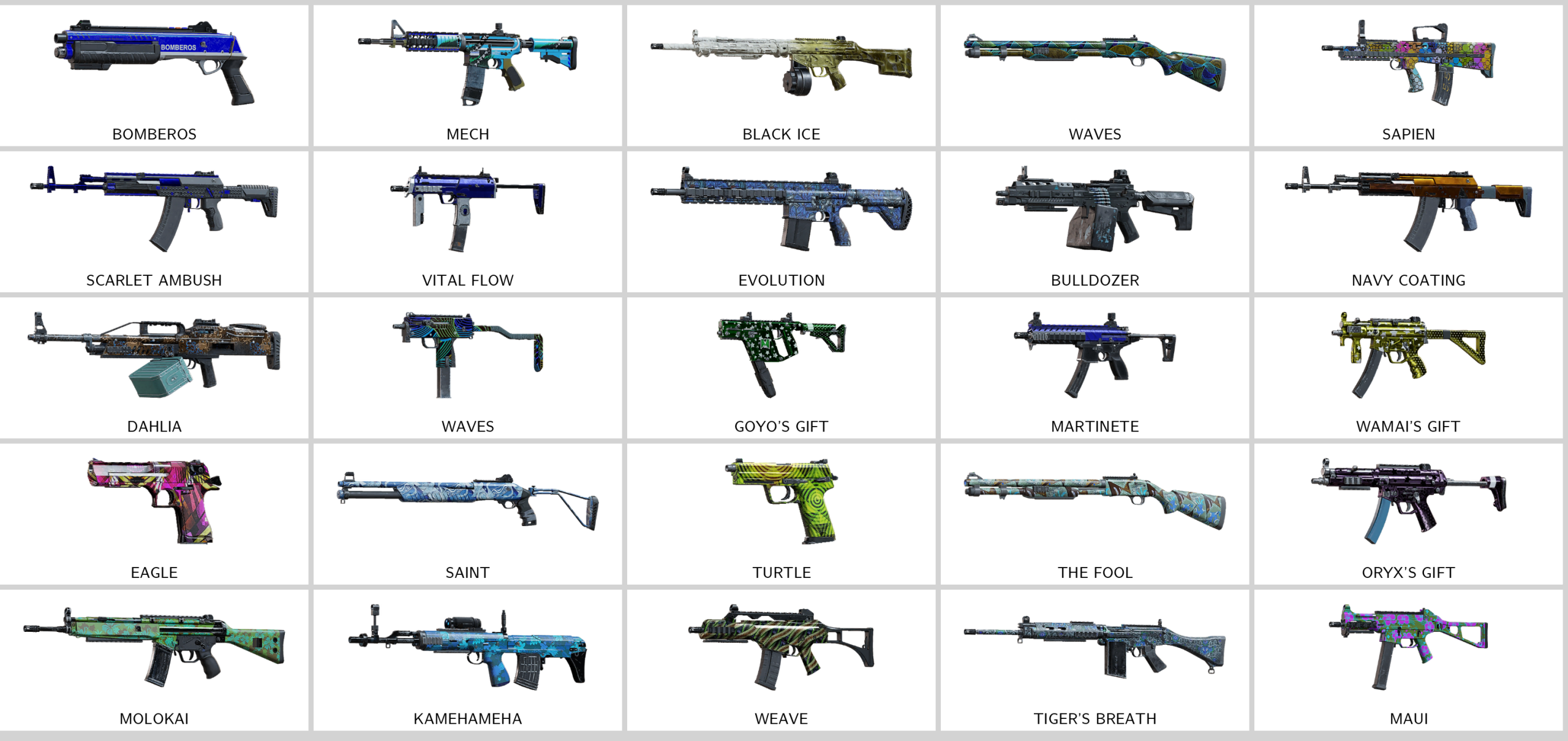 Some of Other Skins: Commemoration (M762), Bomberos (ITA12S), Khokhloma (AK12), Dwyer Hill (Super 90), Mech (C8-SFW), Politsiya (SASG-12), Piston (MP5K), Scarlet Ambush (AK12)…
